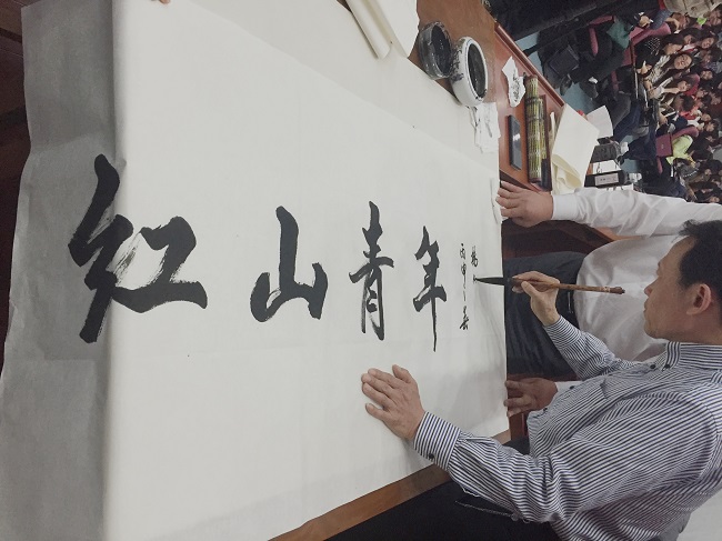 讲座结束后,赵万和老师现场挥毫泼墨,题“红山青年”、“热情与才华创造一切”等与同学们共勉。此次书法讲座让同学们切身体会了传统文化的魅力与能量,感受到了书法的韵味与意境之美。聆听讲座后,有同学表示,“我们在发展现代文明的同时,要注重传承与发扬中国书法,不能让电脑的普及代替文字的书写,让生硬的机器取代柔美的心灵”。