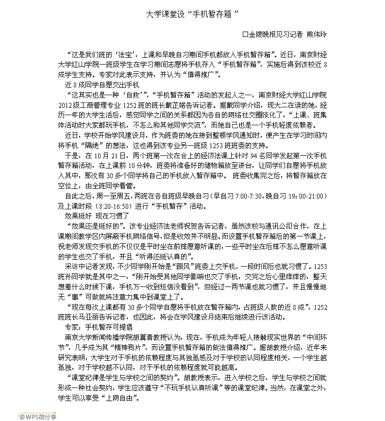 近日,学校开始学风建设月,beat3652012级工商管理专业1252班的班长戴芷婼在接到整顿学风通知时,便产生在学习时间内将手机“隔绝”的想法。现大二在读的她,经历一年的大学生活后,感觉同学之间的关系都因为各自的网络社交圈淡化了,“上课、班集体活动时大家都玩手机,不怎么和其他同学交流”,而她自己也是一个手机轻度依赖者。她的这一想法,也得到该专业另一班级1253班班委的支持。于是,在