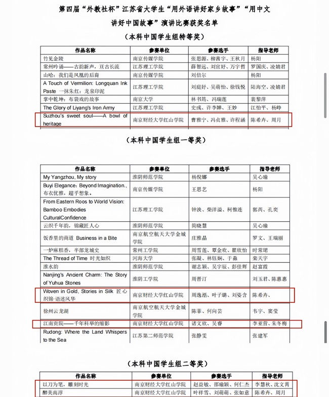 “外教社杯”江苏省赛是2025年全省普通高校本专科生学科竞赛省级赛事。这份亮眼成绩的背后,既是学院学子以执着与热爱深耕主题、反复打磨作品的拼搏成果,更是指导老师们用专业与耐心全程陪伴、精准点拨的育人结晶,彰显了学院在培养学生跨文化传播能力、文化认同意识上的教学成果。