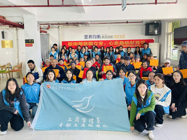 11月12日下午,工商管理学院青歌志愿服务队在指导老师王敏的带领下,赴高淳区砖墙镇康怡堂敬老院开展“情暖立冬 爱满夕阳”主题志愿活动,为敬老院内老人送去冬日第一份温暖。