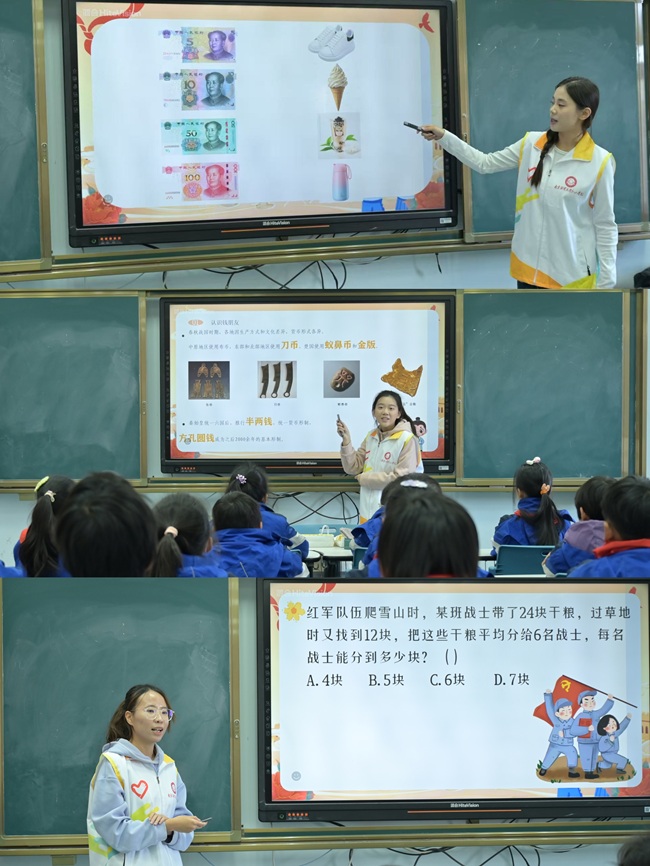 座谈结束后,会计学院“新禾”志愿队与“红日”宣讲团的志愿者们走进古柏中心小学四(3)班课堂,带来了精心设计的《长征路上“财”智行——少儿财商启蒙课》。课程创新融合红色精神与财商理念,以“长征物资管理”为切入点,通过“物价探秘营”“理财闯关记”等情景游戏,让孩子化身“小红军”重温长征故事。志愿者借助互动问答、礼品激励,帮助孩子们建立储蓄、资源规划与合理分配的财商认知。“半条棉被”的故事将课堂推向高潮。志愿者的生动讲述,让孩子们感受先辈奉献精神,理解分享与感恩的意义。课堂氛围热烈,掌声不断,红色文化浸润与财商知识启迪相辅相成。