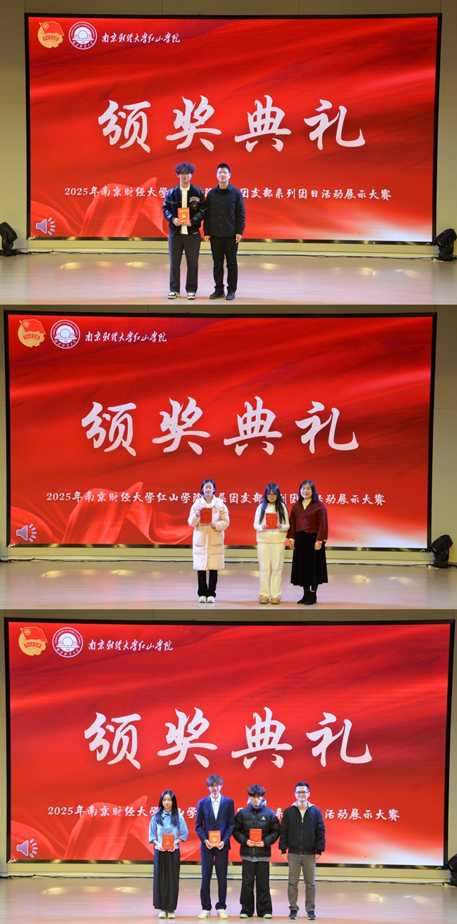 经过激烈角逐,法学2553团支部获得一等奖,营销2553团支部、会计2553团支部获得二等奖,金融2553团支部、审计2554团支部、贸经2551团支部获得三等奖。与会嘉宾分别为获奖团支部颁奖。
