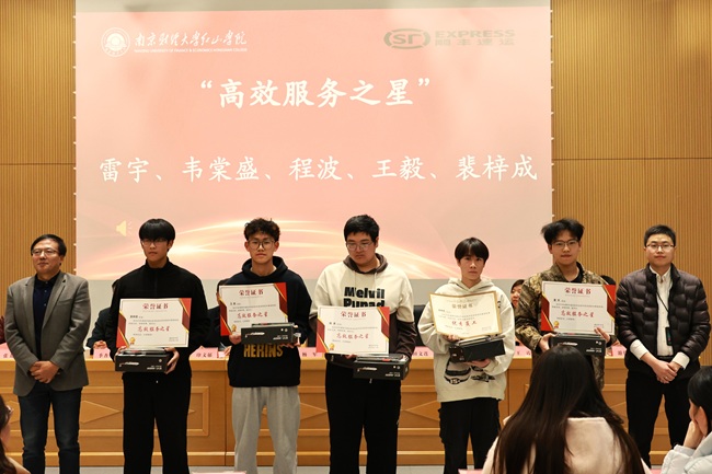 杨军副院长与田文连总经理共同为荣获“高效服务之星”称号的学生颁发荣誉证书与奖品;季杏平副处长与王霞经理共同为荣获“优秀学员”称号的学生颁发荣誉证书与奖品。