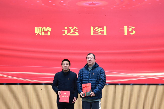 陈新保书记代表高淳区档案馆向红山学院赠送图书,孙彬书记代表学院接受捐赠,双方合影留念。