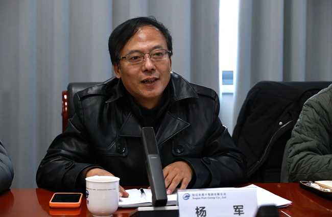学院副院长杨军发表致辞。他详细介绍了学院的发展沿革、师资力量、学科建设和就业情况并阐述了学院应用型、复合型人才的培养目标。他强调校企合作是推动高等教育与产业发展融合的重要路径,希望以此次交流为契机,与港口集团探索多元化合作模式。