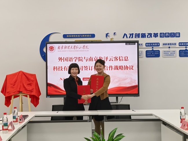 为深化产教融合,强化校企协同育人实效,搭建高质量实践教学与人才培养平台,4月16日下午,外国语学院与南京象泽云客信息科技有限公司校企合作战略协议签署暨就业实习基地授牌仪式在智圆楼B区329会议室顺利举行。南京象泽云客信息科技有限公司总经理吴丽萍、人事专员丁琳,学院党委副书记高永东,外国语学院院长肖辉,学工负责人何玉凤,团总支书记赵悌芳,教学秘书卞静参加。