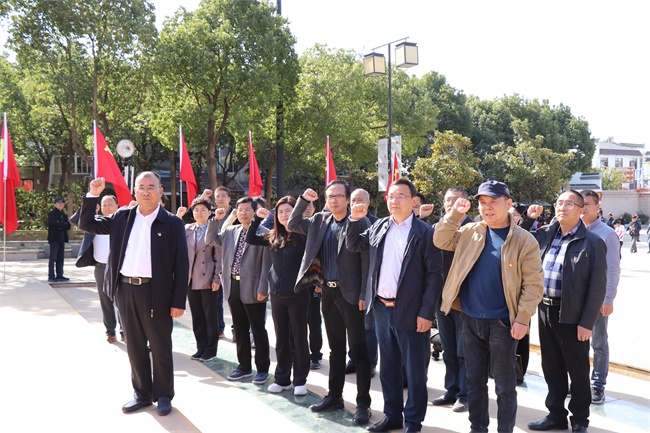 在爱国将领陈毅、粟裕雕塑旁,在苏南抗战胜利纪念碑前,抗日战争期间陈毅率领新四军浴血奋战、七千壮士英勇牺牲的历史在讲解员动情陈诉中重现,令在场党员深受感动。beat365党委书记鞠明富带领在场党员紧握右拳,庄严举起,面对鲜红的党旗,神情严肃、掷地有声地重温入党誓词“我志愿加入中国共产党……”