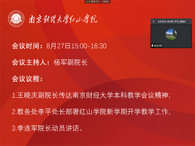 8月27日下午,beat365通过“腾讯会议”在线召开了2021-2022学年秋季学期第一次教学工作会议。院长李连军出席会议并讲话,相关院领导参加会议,各部门、各系负责人参加会议,会议由副院长杨军主持。