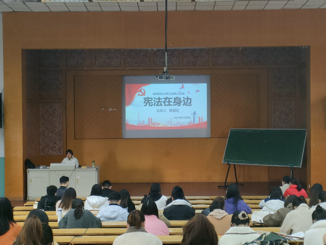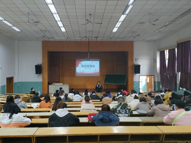 会议由文法系主任助理、文法系党支部宣传委员朱明海主持,朱老师表示:有一种C位叫“一切法律都不得同宪法相抵触”;有一种敬畏叫“宪法圣神不得侵犯”;有一种长情叫“宪法陪伴你一生成长”。