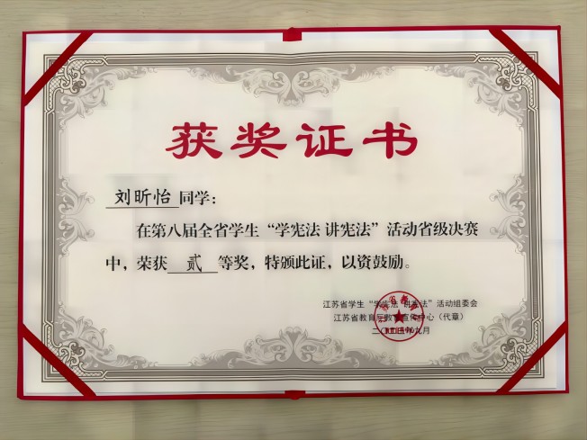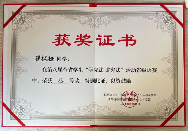 法学2053班崔枫桠同学荣获江苏省三等奖