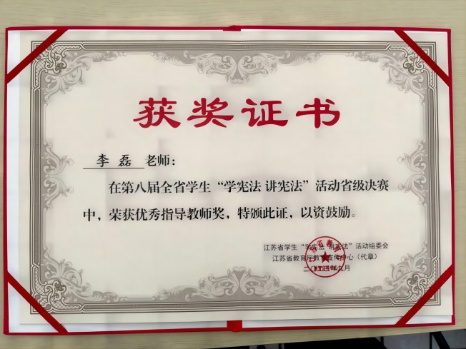 12月1日,江苏省第八届“学宪法 讲宪法”活动传来喜讯,beat365文法系法学2151班刘昕怡同学获得省级决赛(演讲比赛)二等奖、文法系法学2053班崔枫桠同学获得省级决赛(素养竞赛)三等奖、文法系系主任李磊老师荣获优秀指导教师奖、文法系邱睿老师指导作品《“法治中国青春行”专项普法实践》获得法治实践教育精品案例“优秀作品”奖,实现了我校在该项赛事中的突破。