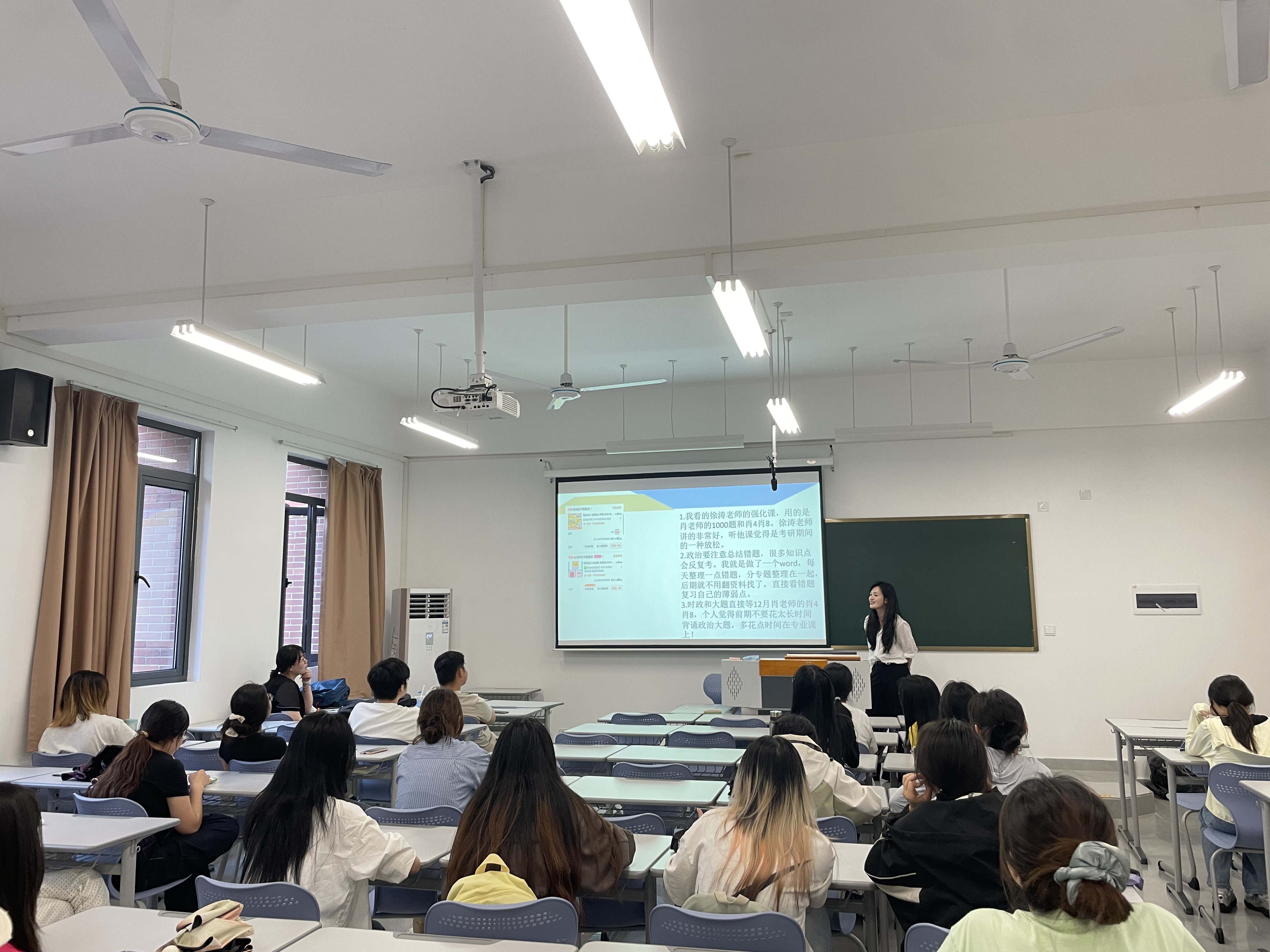 在互动答疑环节,同学们积极提问,问题涉及如何平衡日常课程与备考复习、如何提高记忆效率、如何缓解考前焦虑等具体问题。学长学姐们结合自身经验耐心解答,并鼓励大家保持信心,持之以恒,以积极的心态迎接考试挑战。