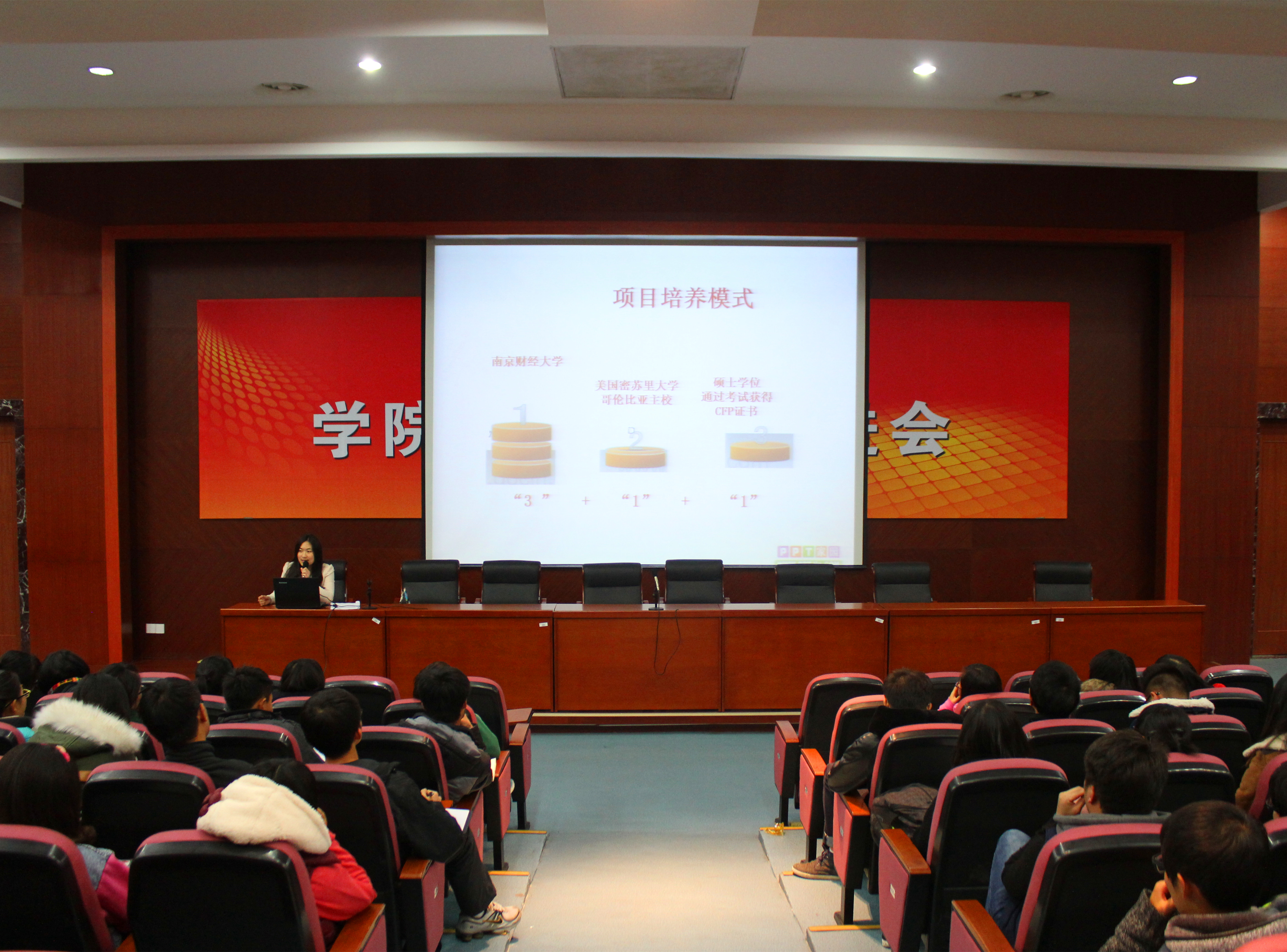 首先,马老师对密苏里大学哥伦比亚主校进行了简单的介绍。学校成立于1839年,是一所美国综合类公立大学,素有“公立长春藤名校”的美誉,在美国大学中排名前100位。接着,马老师详细介绍了beat365英国官方网站和密苏里大学哥伦比亚校区合作的,国际注册理财规划师中外学生交流项目。项目的培养模式为“3+1+1”,即我们的同学在beat365学习三年以后,通过相关材料的递交就能直接进入密苏里大学个人理财规划专业学习,一年后达到相关要求即可就读学校的硕士,并在硕士期间通过考试获得CFP的证书。接下来,马老师对招收对象、学习费用和申请要求进行了说明,她表示,招生对象为大二、大三学生,在美的学费约为15万人民币一年。对于申请者,该项目要求托福不低于79或雅思不低于6.5,且国内课程GPA达到3.0以上,并具有一定经济能力和美国领事馆的签证。最后,马老师还向同学们推荐了他们的英国牛津的冬季游学项目。