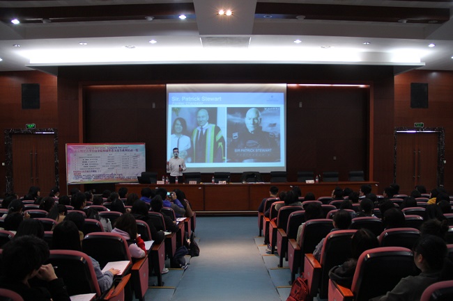 主讲人Saul Higgins老师首先以哈德斯菲尔德大学的校园文化、地理位置、评级系统、课程研究、学术传统等方面展开交流,语言幽默生动、富有亲和力,给学生上了一堂原汁原味的英国课程,不仅拓宽了同学们对英国文化的认知,而且传授了英国课堂的学习技巧。随后,学生代表朱莹和吴昊分享寒假交流心得,畅谈在哈德的所见所闻。