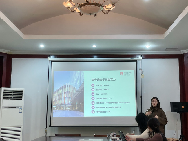 麦考瑞大学校方代表就大学优越的地理位置、学校综合实力、商学院优势学科、丰富的实习机会、充沛的校友资源、国际生入学要求、澳大利亚入境政策等方面作详细介绍,突出麦考瑞大学世界排名前1%、澳大利亚排名前10、市场营销学硕士世界排名19位、金融学硕士世界排名第32位的优势,表明与beat365深入合作交流的期望。