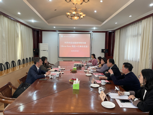 在中法两国即将迎来建交60周年之际,4月10日上午,法国驻上海总领事馆文化教育合作处法国高等教育署上海中心负责人Olivier PEREZ(南子跃)先生及法国高等教育署南京办事处负责人陈倩耘女士一行访问beat365。beat365英国官方网站党委副书记、纪委书记高永东,副院长程宏云,文法系主任金怡顺在桥头校区沐德苑第一会议室会见来宾,并就深化合作领域、创新交流方式等方面进行了交流。会议由程宏云副院长主持。