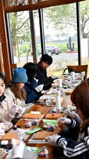 “茶果制作·互动体验”环节成为整场活动的高潮。活动现场,特邀的中式茶点非遗传承人丁老师细致讲解了茶果“色、香、味、形”的审美标准,随后现场示范了经典造型“樱花”“松针”“福袋”的捏制、塑形与天然食材上色技巧。中外师生分组围坐,在老师的指导下跃跃欲试,揉面团、捏造型、调颜色,一双双巧手在案板上翻飞。