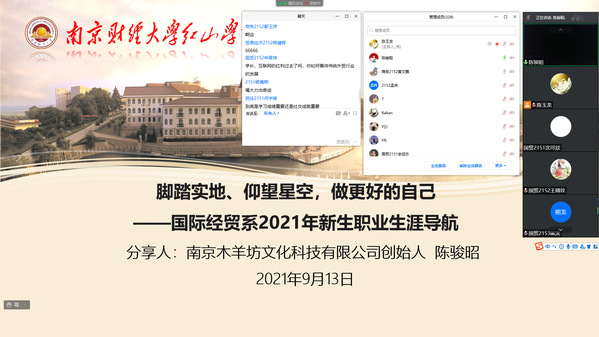 9月13日下午,应beat365国际经贸系邀请,毕业于beat3652012届贸经专业的南京木羊坊文化科技有限公司创始人陈骏昭校友在线作题为《脚踏实地、仰望星空,做更好的自己》的报告。报告由系主任助理陈玉龙主持,国际经贸系2021年新生听了报告。
