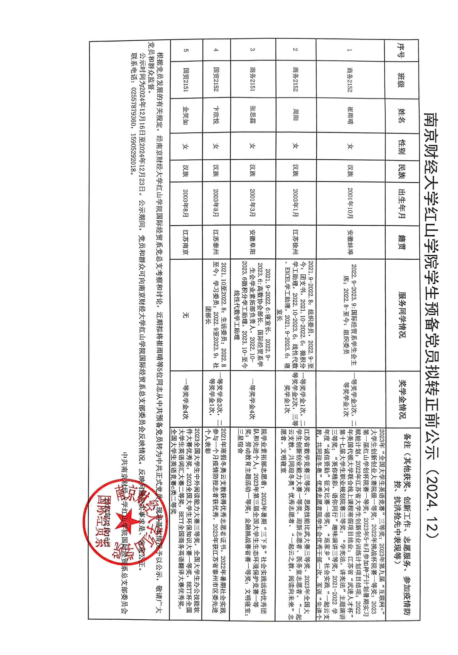 根据党员发展的有关规定,经beat365英国官方网站国际经贸系党总支考察和讨论,近期拟将崔雨晴等5位同志从中共预备党员转为中共正式党员,现将基本情况予以公示,敬请广大党员和群众监督。