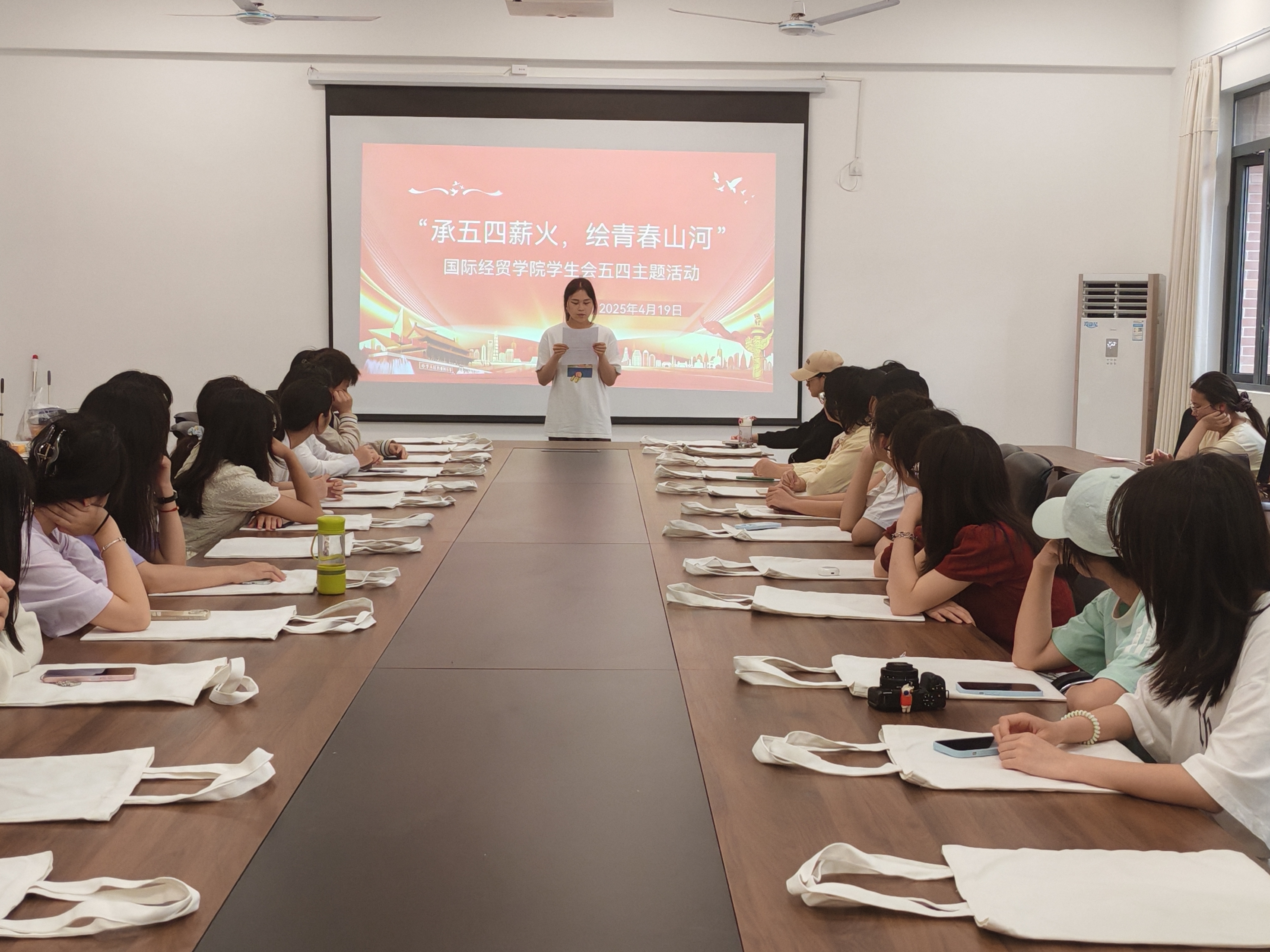 4月19日下午,在迎接“五四运动”106周年之际,国际经贸学院学生会以“承五四薪火,绘青春山河”为主题,创新性地将非遗拓染技艺与红色文化教育相结合,举办了一场别开生面的主题风采展示活动。活动通过艺术创作、历史教育与环保实践的新颖结合,生动诠释新时代青年传承革命精神、赓续文化根脉的使命担当。本次活动共有来自各个学院的30余名学生参加。