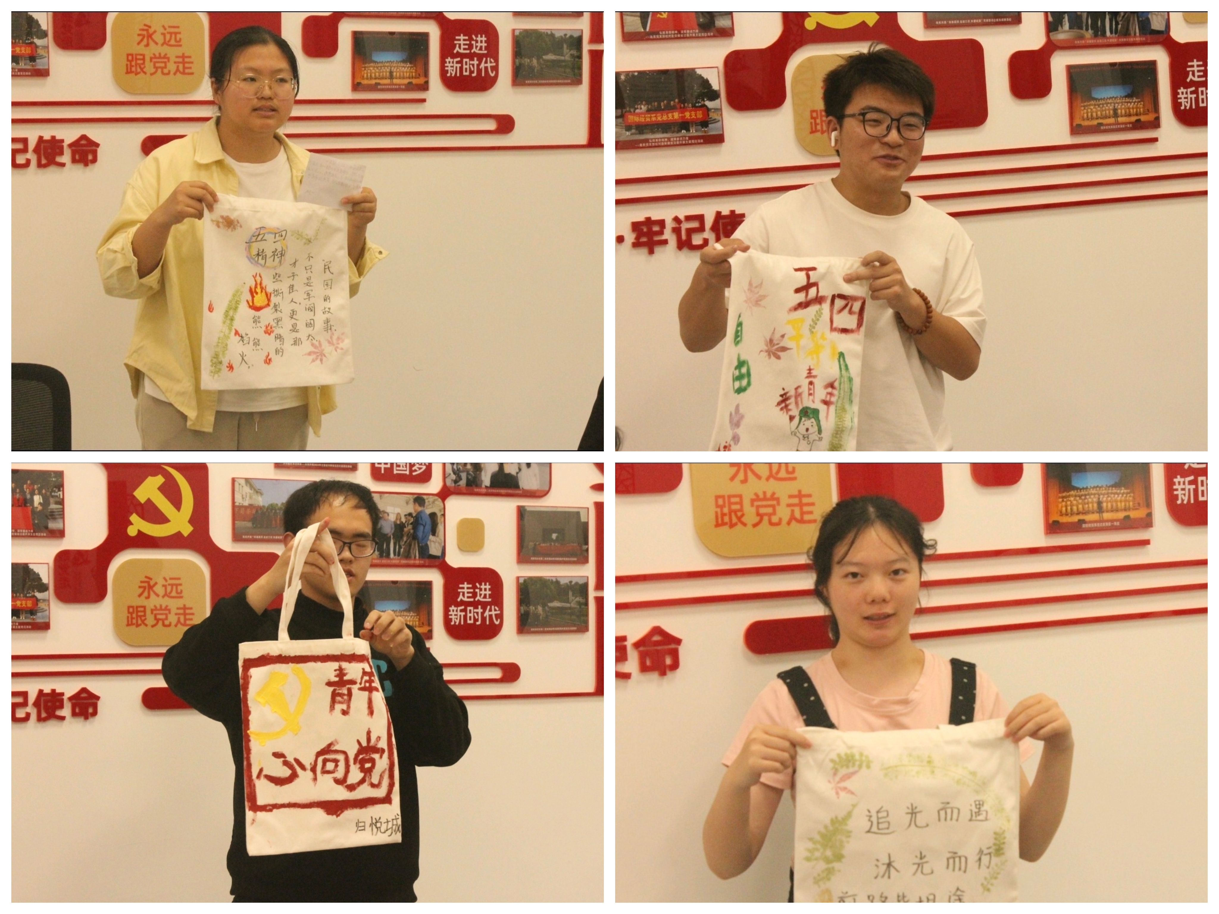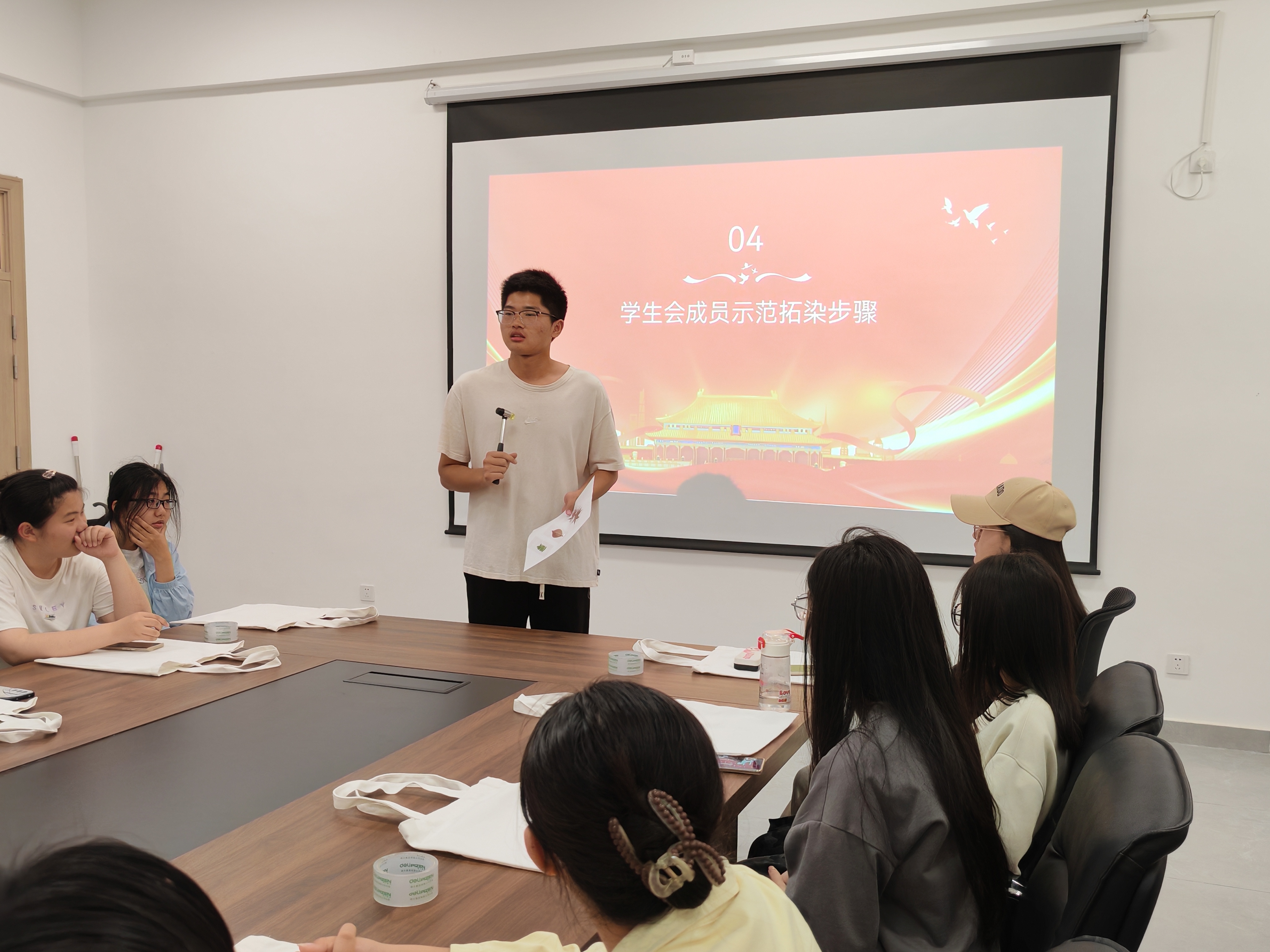 手工制作环节,首先播放了植物拓染视频,让同学们对如何通过拓染在帆布包上设计制作有了初步了解。随后,在贸经2352赵旭同学的示范下,在场同学开始了作品制作体验。有的巧妙融合红色元素,有的以五四口号为灵感设计文字拓印,有的用红色花瓣象征革命热血……最后的作品交流环节,同学们热情高涨,积极发言分享自己的设计理念与作品内涵。