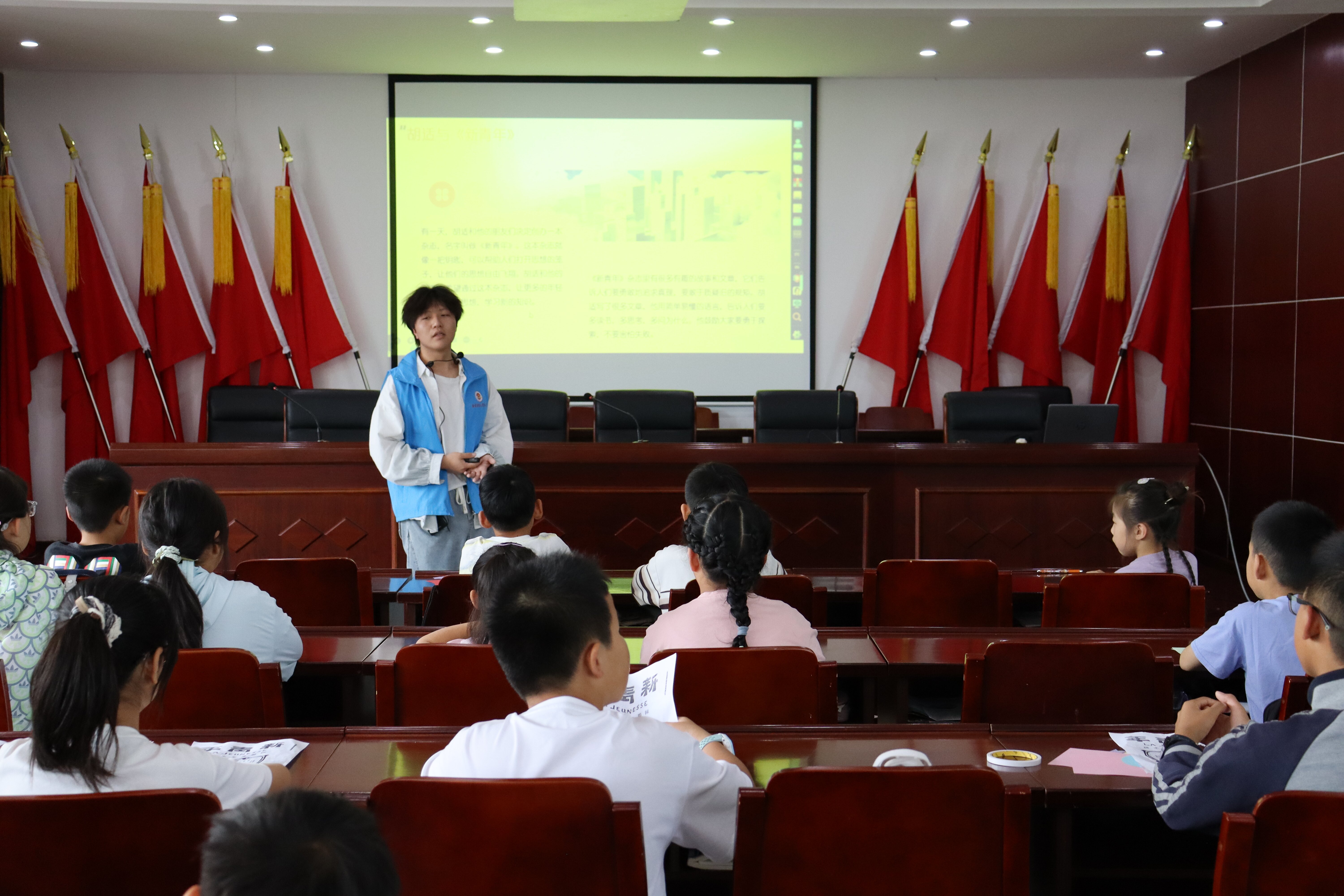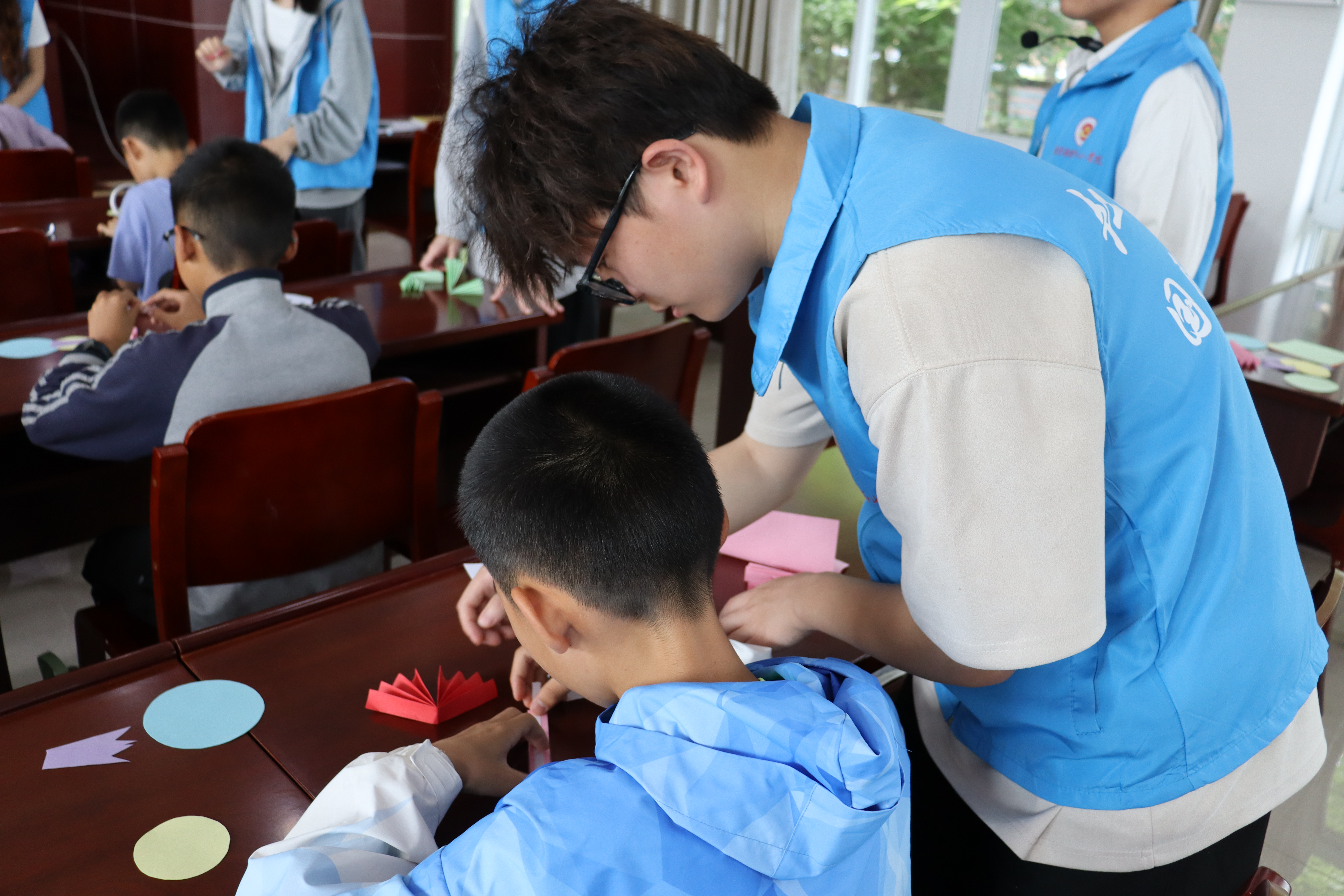 在制作“五四”小勋章手工活动中,“绿禾”志愿队成员们带领小学生用彩纸、画笔、双面胶等材料,亲手制作了象征五四精神的纸质勋章。两名手工示范员耐心细致地从折纸、装饰到粘贴手把手指导,孩子们则全神贯注地完成一件件新颖别致的作品,在动手实践中深化对五四精神的理解。