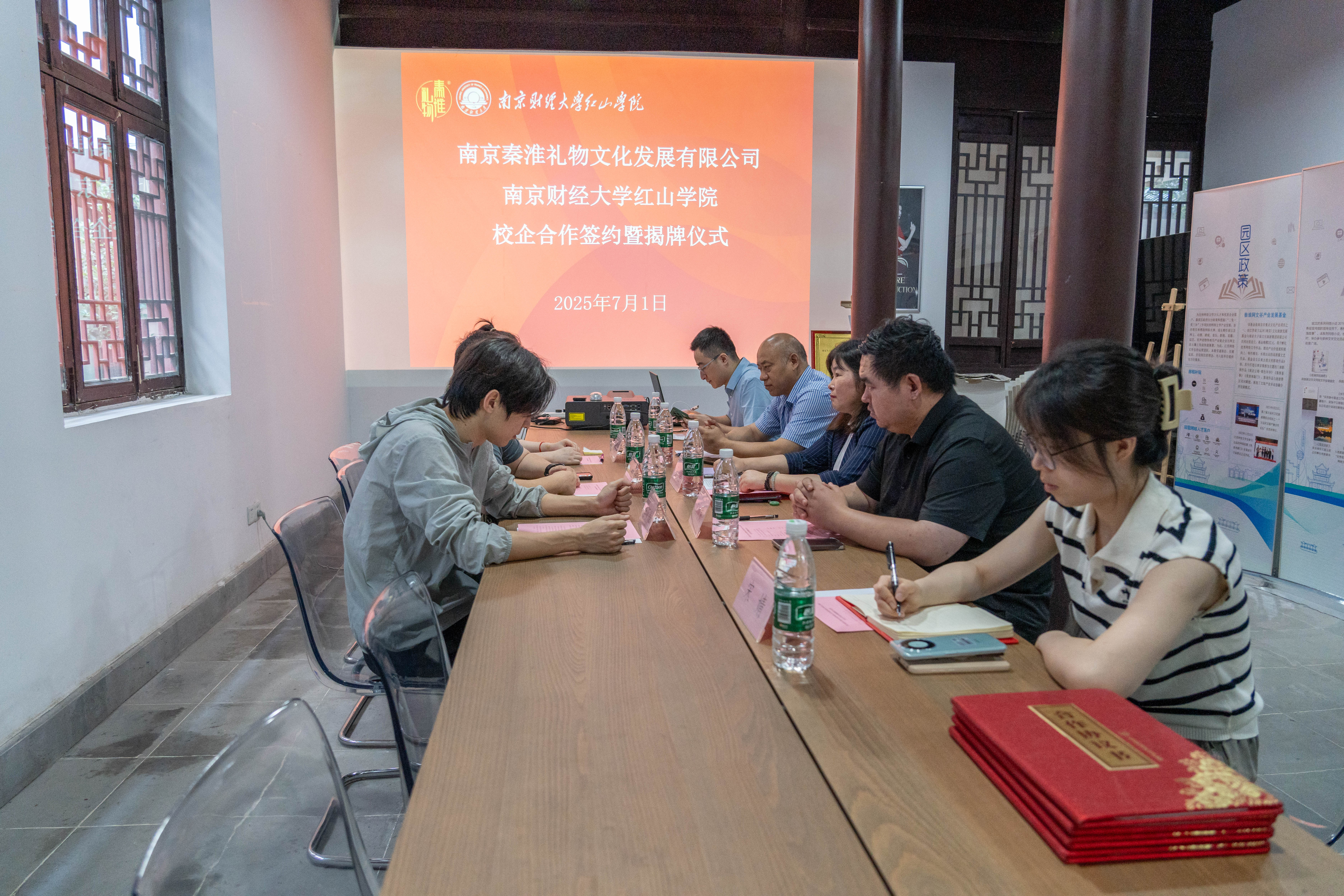 为深化产学研融合,共筑人才培育新高地,7月1日,学院党委副书记、副院长王晨婷带队赴南京秦淮礼物文化发展有限公司开展校企合作签约暨挂牌仪式。院党总支书记、院长刘志国,党总支副书记陈玉龙,团总支书记宋婧陪同。秦淮礼物文化发展有限公司总经理唐文博、综管部主任戴晓菡、市场部主任李亚康参加活动。会议由陈玉龙副书记主持。