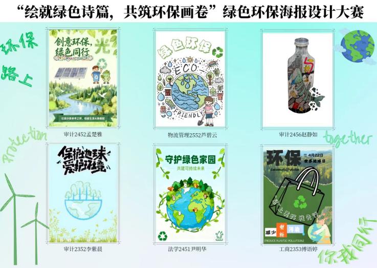 参赛同学们运用水彩、数码板绘等多种媒介,从不同视角诠释对“绿色环保”的理解。审计2456赵静如同学以“瓶子”喻家园,聚焦海洋垃圾污染,借鲸鱼悲鸣的意象,强调人类与生态共生,呼吁每个人扛起生态保护责任。审计2452孟楚雅同学围绕“创意环保,绿色同行”,融合骑行、光伏板等元素,以柔和风格传递“垃圾分类+低碳生活”的可及性,倡导和谐生态。物流2552芦碧云同学以童趣手绘让环保更亲近,通过地球、孩童种树等元素,将环保从口号转化为亲手参与的行动,邀请人人成为地球守护者。审计2352李紫晨同学以“保护地球、爱护环境”为核心,用地球、绿植与清新色调,营造自然氛围,唤起对美好生态的热爱,鼓励从自身践行环保。法学2451尹明华同学聚焦“守护绿色家园,共建可持续未来”,以森林、小动物环绕的地球为主体,吸引大众关注,传递生命共生与节约资源的理念。工商2353傅语婷同学以环保袋为载体,传递“减少塑料污染”理念,呼吁从日常小事践行环保,让绿色行动更有温度。