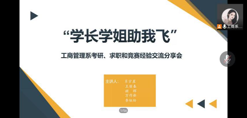 5月4日晚,工商管理系通过腾讯会议平台开展举办“学长学姐助我飞”暨考研、求职和竞赛经验交流分享会,邀请5名优秀应届生代表作主讲。此次分享会由工商系团总支书记兼学工秘书王海萍老师主持,本系学生踊跃参加。