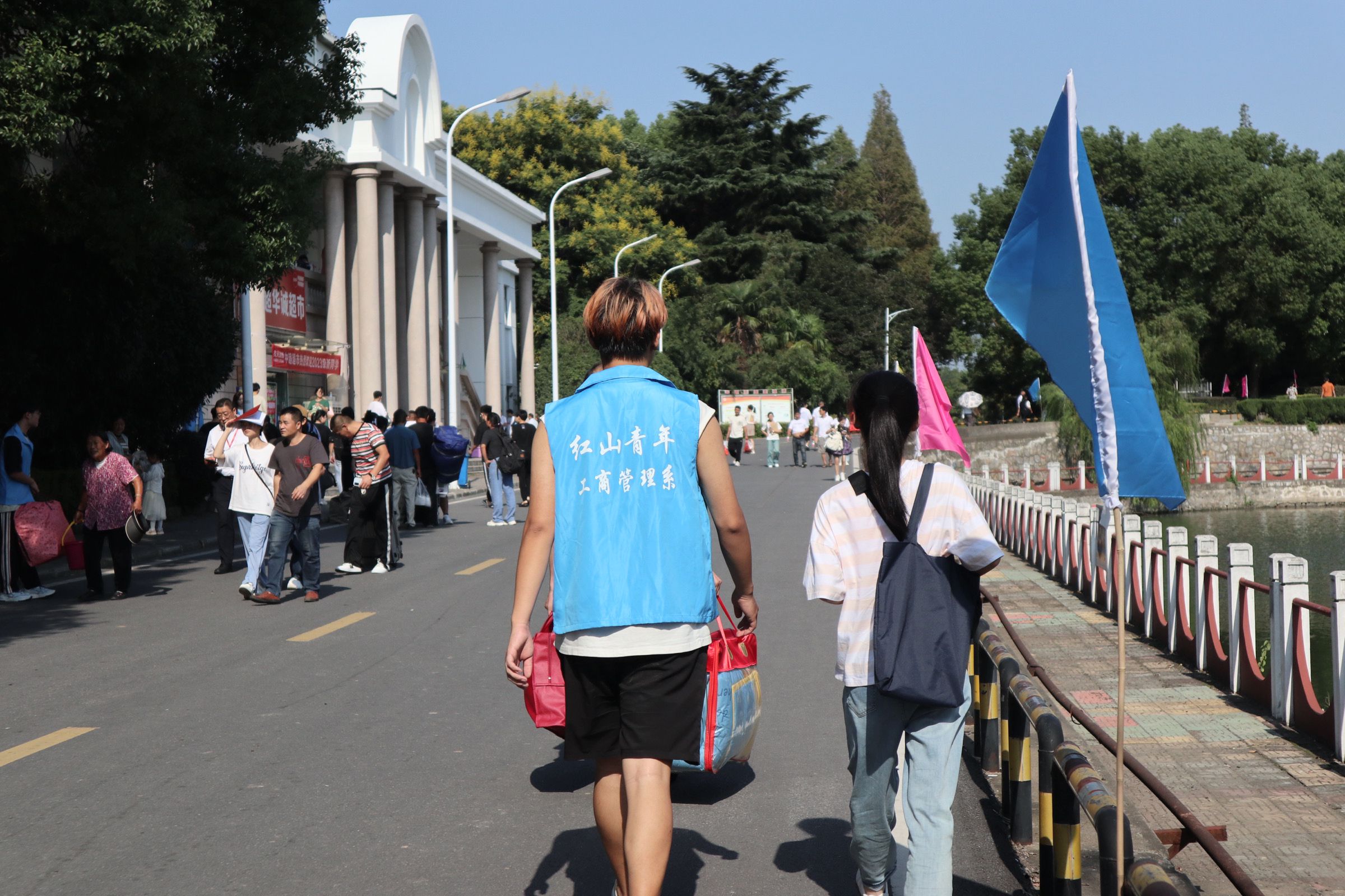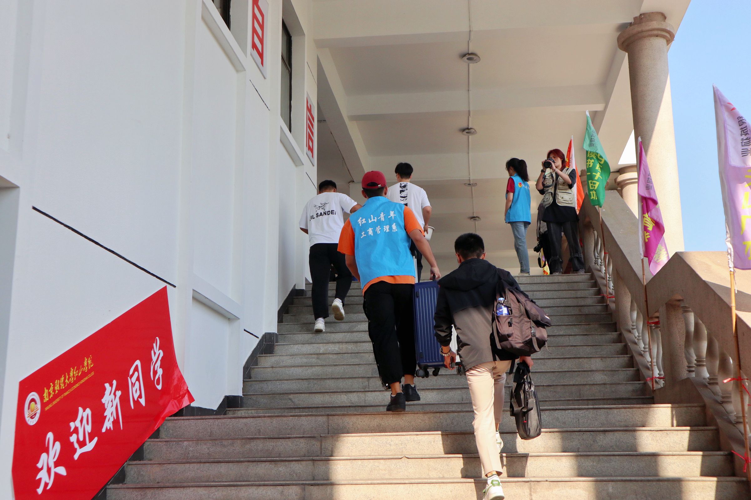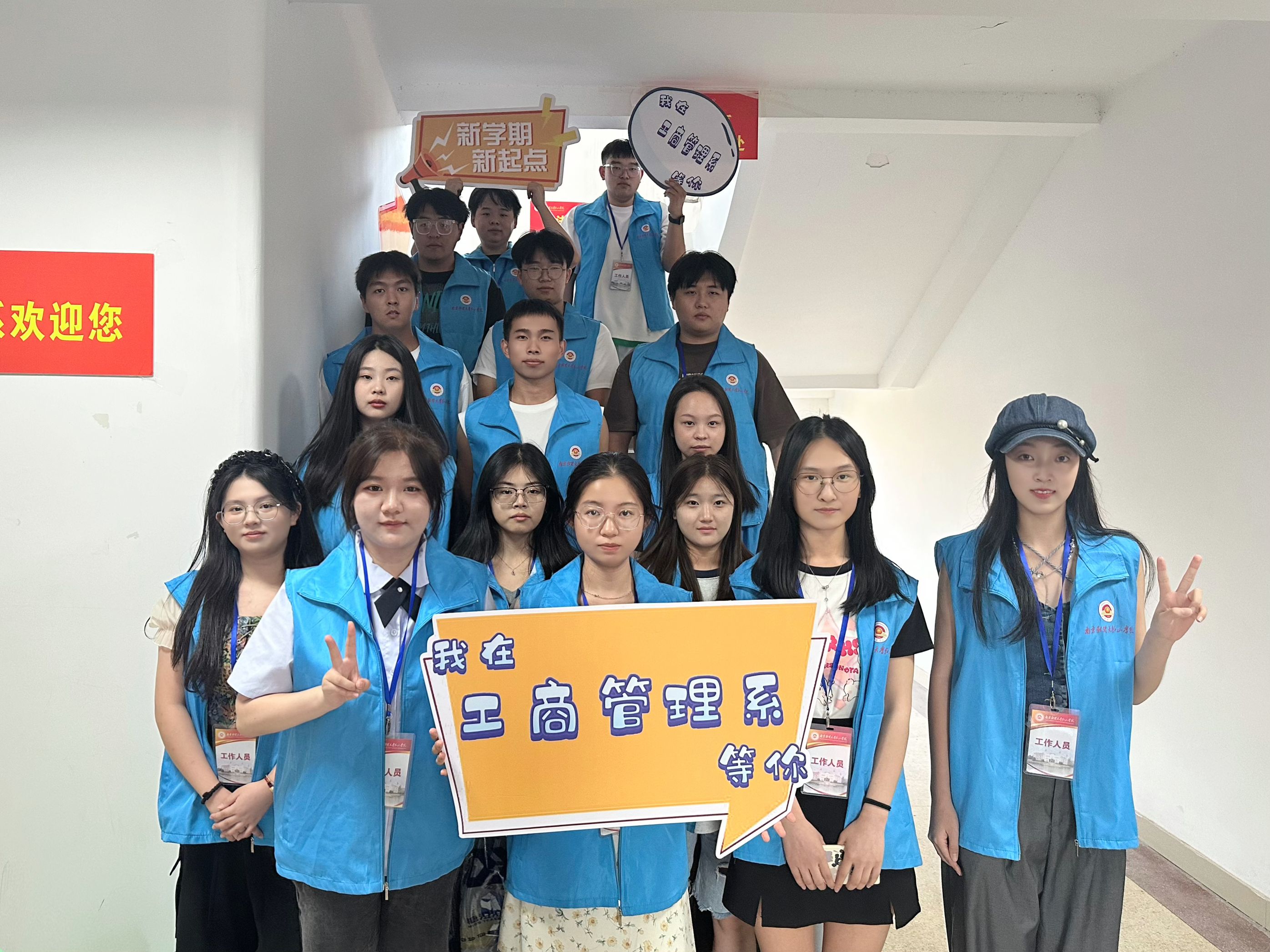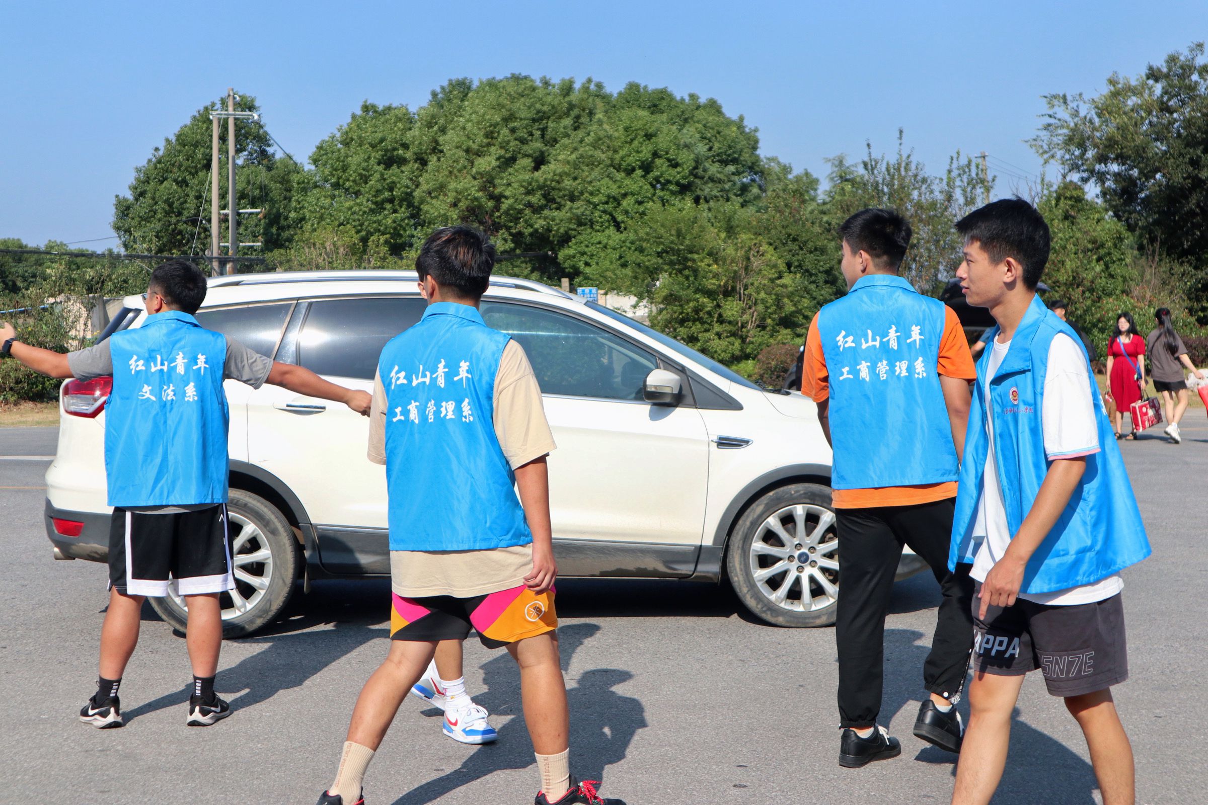 志愿者用心服务,助力迎新工作。工商管理系志愿者身着“蓝马甲”,佩戴工作牌,手举迎新牌,热情洋溢,以最饱满的精神状态迎接每一位新生的到来。在校园南大门、停车场,志愿者们从学生和家长手中接过沉重的行李,将新生引导至寝室,一路上向新生介绍校园环境、展示“红山青年”精神,体现“工商领航”风貌。在教务楼走廊和辅导员办公室,志愿者们坚持“一对一”用心服务原则,带领新生进行“新生报到”、“人脸采集”和“身份核验”。从朝阳到夕阳,学院的每一个角落都有工商管理系志愿者的身影,他们无私奉献、不负韶华、尽职尽责的精神感染了每一位新生同学,充分展示了工商学子的榜样力量!