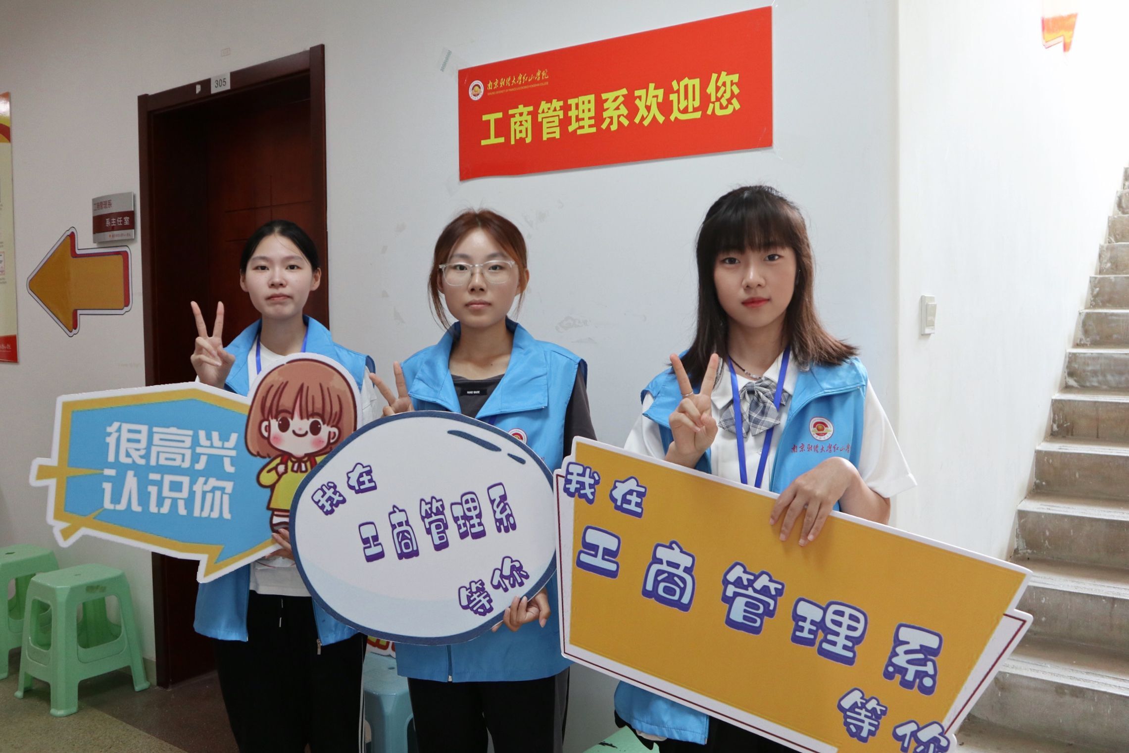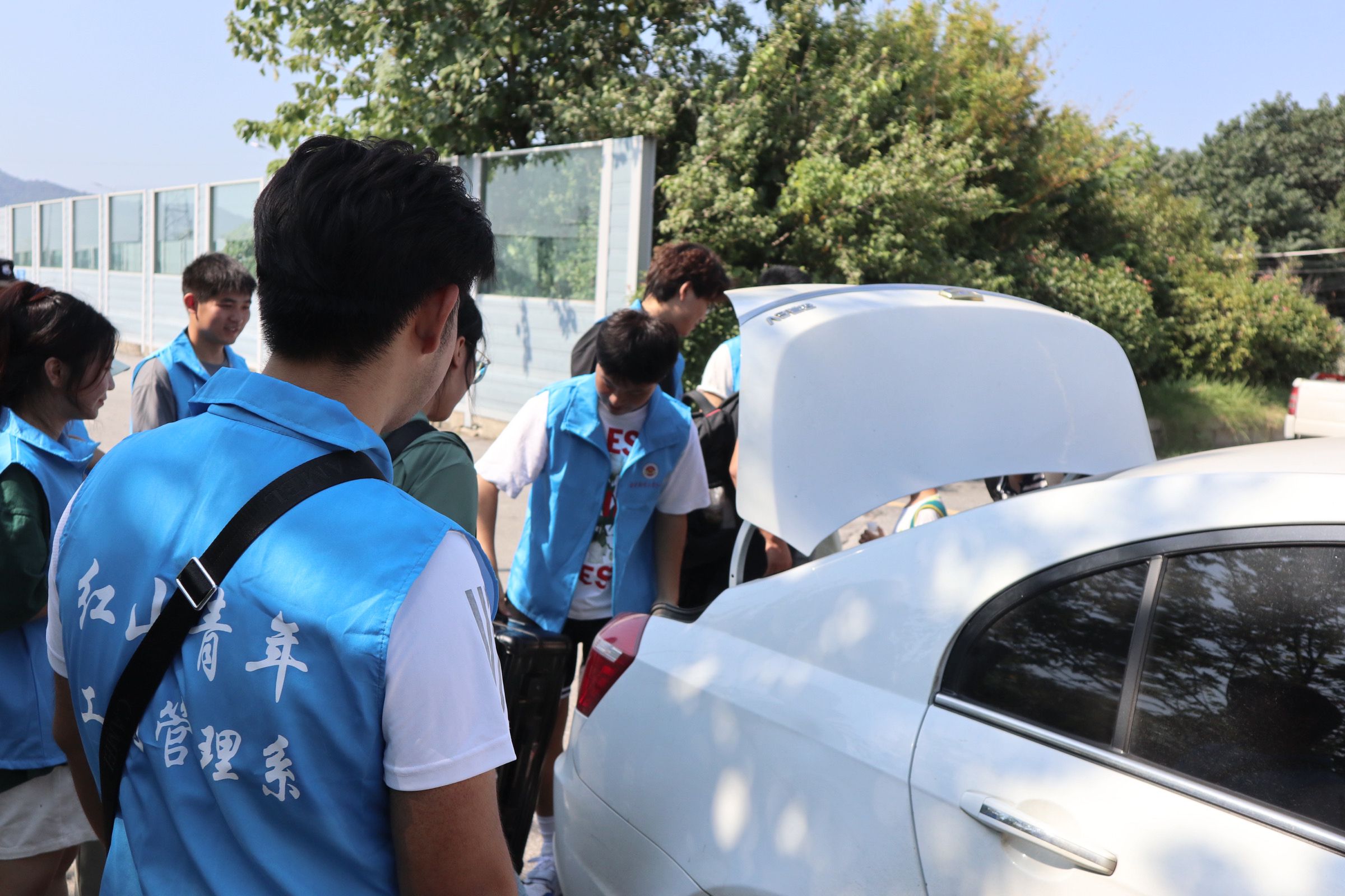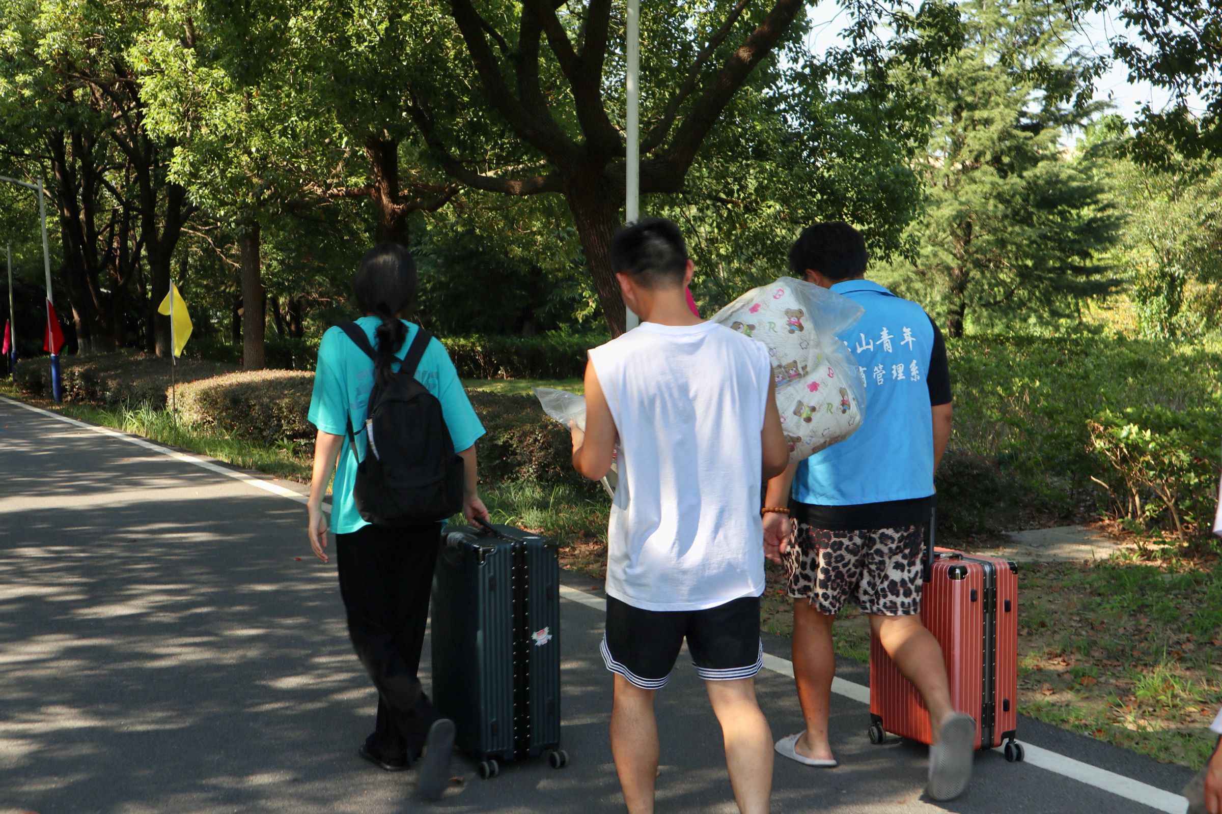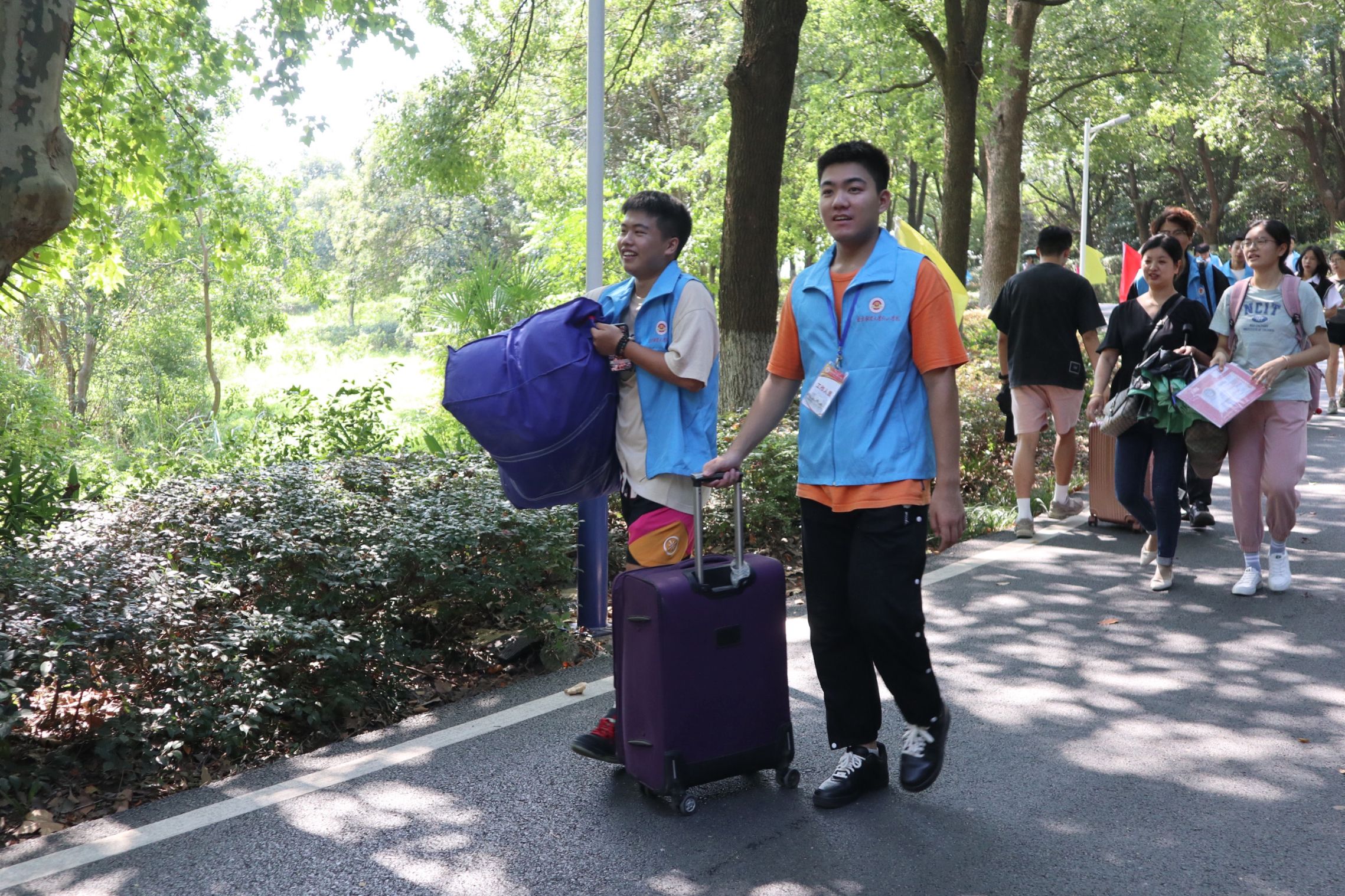 志愿者用心服务,助力迎新工作。工商管理系志愿者身着“蓝马甲”,佩戴工作牌,手举迎新牌,热情洋溢,以最饱满的精神状态迎接每一位新生的到来。在校园南大门、停车场,志愿者们从学生和家长手中接过沉重的行李,将新生引导至寝室,一路上向新生介绍校园环境、展示“红山青年”精神,体现“工商领航”风貌。在教务楼走廊和辅导员办公室,志愿者们坚持“一对一”用心服务原则,带领新生进行“新生报到”、“人脸采集”和“身份核验”。从朝阳到夕阳,学院的每一个角落都有工商管理系志愿者的身影,他们无私奉献、不负韶华、尽职尽责的精神感染了每一位新生同学,充分展示了工商学子的榜样力量!