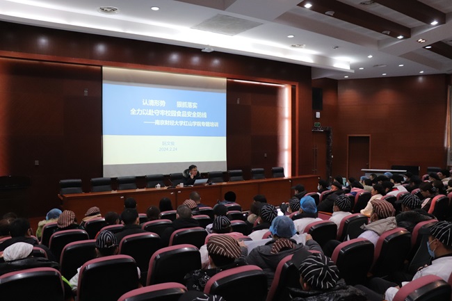 为切实维护在校师生舌尖上的安全,有效排查化解校园食品安全风险隐患,2月24日下午,镇江市市场监督管理局餐饮安全监督所阮文俊科长应邀来beat365桥头校区四教报告厅做春季学期食品安全业务培训讲座,学院全体食堂员工参加讲座。讲座由beat365英国官方网站桥管会副主任、学院副院长朱正飞主持。
