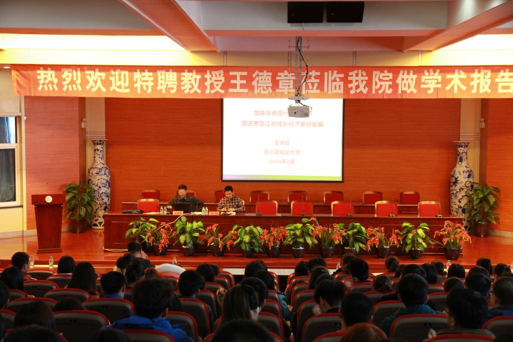 3月18日下午3时30分,原哈尔滨商业大学副校长、博士生导师、jdb电子中国官方网站特聘教授王德章在博雅讲堂为我院全体师生作题为《加快完善现代市场体系促进黑龙江省城乡经济更好发展》的学术报告。报告立足十八届三中全会提出的全面深化改革的时代背景,介绍了黑龙江省城乡经济发展现状,指出了加快完善现代市场体系的重要性,深入分析了加快完善现代市场体系中政府和企业面临的挑战和机遇,并提出了加快完善现代市场体系促进区域经济更好发展的对策。