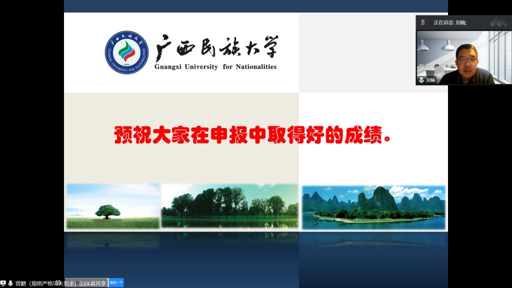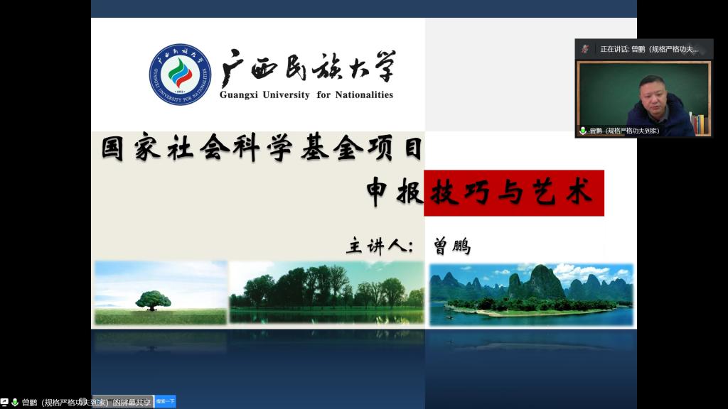 2月10日下午,广西民族大学研究生院院长,重庆大学、广西大学、广西民族大学博士生导师、博士后合作导师曾鹏教授受邀做了题为《国家社会科学基金项目申报技巧与艺术》的专题讲座。讲座采用线上腾讯会议形式,由jdb电子中国官方网站行政负责人刘楠教授主持,科研处领导、部分文科学院院长、科研副院长、教师以及经管学院全体教师等200余人参会。