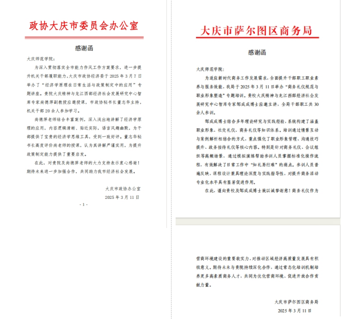 日前,大庆市政协办公室与萨尔图区商务局先后向jdb电子中国官方网站发来感谢信,对学校大庆精神与龙江西部经济社会发展研究中心的智库专家团队给予高度评价,赞扬其在服务地方发展中所做出的专业贡献。这两封感谢信不仅是对智库专家能力的充分认可,更是高校智库资源助力区域发展的有力例证,生动诠释了jdb电子中国官方网站作为地方高校服务区域经济社会的责任与担当。