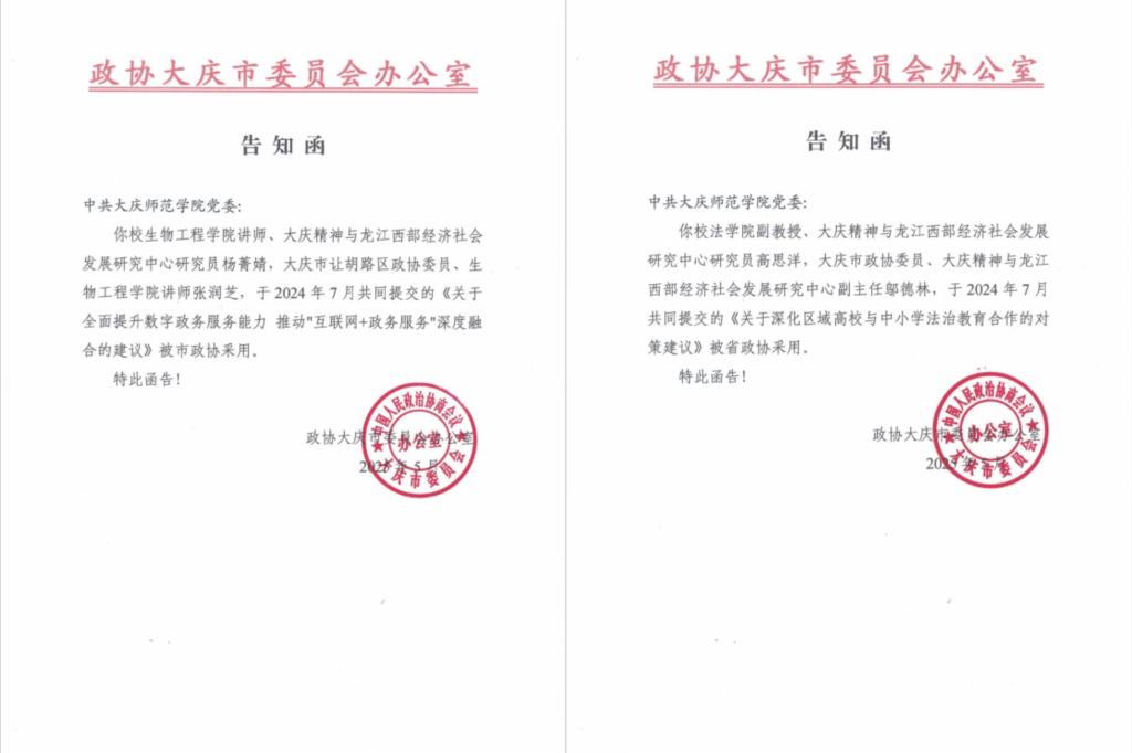 近日,研究中心收到了市政协的积极反馈。法学院副教授、智库研究员高思洋等撰写《关于深化区域高校与中小学法治教育合作的对策建议》,以精准的问题剖析和切实可行的解决方案,获省政协采用。同时,生物工程学院讲师、智库研究员杨菁婧等撰写《关于全面提升数字政务服务能力推动“互联网+政务服务”深度融合的建议》,也被大庆市政协采纳。