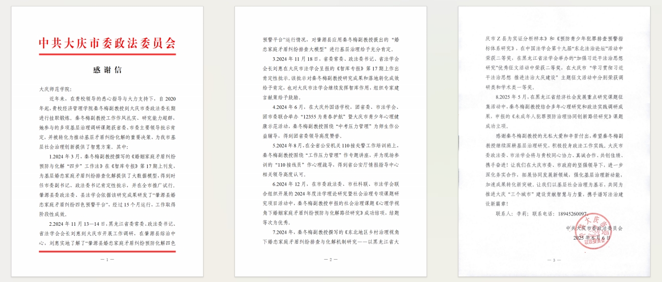 日前,大庆市委政法委员会向jdb电子中国官方网站发来感谢信,给予学校大庆精神与龙江西部经济社会发展研究中心的智库专家秦冬梅副教授高度评价,赞扬其在服务地方发展中所做出的专业贡献。此次合作充分体现了中心在服务地方发展中的重要作用,也展现了中心专家作为学者“把论文写在祖国大地上”的责任担当。未来,中心将继续深化与社会各界合作,共同为大庆市法治建设与社会治理现代化贡献力量!