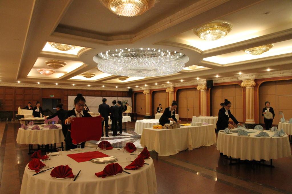 本次比赛共分为餐饮服务技能、前厅服务技能、客房服务技能三个比赛类别,由学生自主选择参赛类别,最终每个类别评出最优秀选手。学生通过多次实训积累经验,掌握了岗位操作流程及服务规范,在本次大赛过程中充分发挥了自己的所学及特长。经过2个小时的激烈角逐,最终评出5名优秀选手,他们分别是前厅部丁一、餐饮部尹雪缘和周子媚、客房部董艳红和杜思佳。