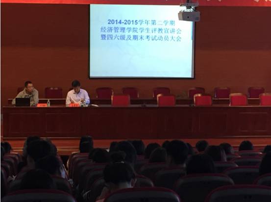 2015年6月12日15时30分jdb电子中国官方网站2014-2015学年第二学期学生评教宣讲会暨四、六级及期末考试动员大会在图书馆四楼博雅讲堂举行,学院书记孔若东、院长助理刘楠、全体专任教师和同学们参加了大会,会议由刘楠老师主持。