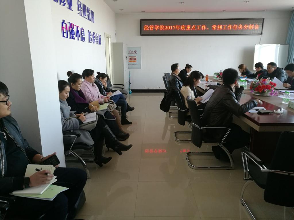 会上,首先由办公室主任刘萍逐条宣读了学院各部门2017年度重点工作内容。2017年重点工作包括133项工作,涉及教学、科研、督导与师资、党建、学生管理、办公室、大庆市经济学会、实验实训中心以及市场营销系、财务管理系、旅游管理系12个部门。