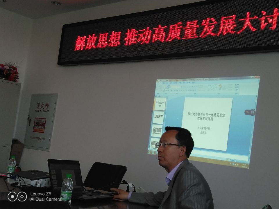 郝毓业老师作了题为《论青年教师课程定向与学术方向的三重门》的发言,郝老师提出困扰青年教师职业发展道路的“三重门”,即课程方向确定不了方向,学术研究研究不出中心,课程与学术相互脱节,进而提出“四密钥”,即长者导之,青者习之;生活学术化,学术生活化;一处敲之,静听回响;课程为王,工作过程导向,并将赴北京参会学习到的关于《客房运营管理》这门课程的收获与心得与教师分享。王剑副教授站在一线教师的角度,从思想认识、教学研究及高质量人才培养方面谈了自己的心得体会。他提出思想是大事,要对标一流,时不我待。对标一流,才能更好地找到差距,明确方向,并通过对标一流,找到自身在教学研究方面的不足,最后提出“教学需要的,可能不是革新,而是回归。能够坚守初心,不计名利的教育工作者才能真正为学校的高质量发展做出自己的贡献”。金熙成教授最后作了题为《探讨高等教育后向一体化的职业教育发展道路》的发言。金教授从宏观的角度分析我国高等教育体制的缺陷,并提出建立与985、211院校全面对接的大学职业教育体系,即高等院校职业教育后向一体化战略,最后提出jdb电子应加强“双师双能型”教师的建设,即“教师+工程师”、“智能+技能型”教师队伍,准备建设成为与985和211对接的职业教育大学。