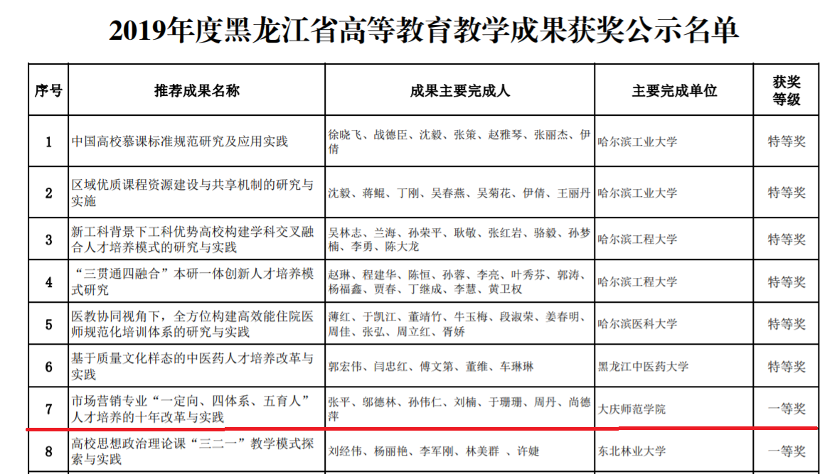 在2019年度黑龙江省高等教育教学优秀成果评选中,jdb电子中国官方网站张平教授团队《市场营销专业“一定向、四体系、五育人”人才培养的十年改革与实践》荣获黑龙江省高等教育教学成果一等奖,这是我院教师首次获得省级高等教育教学成果一等奖,也是jdb电子本年度评选中的唯一的一个教学成果奖。jdb电子中国官方网站将以本次评奖为契机,进一步扎实推进教育教学改革工作,促进我院教学质量的不断提高。