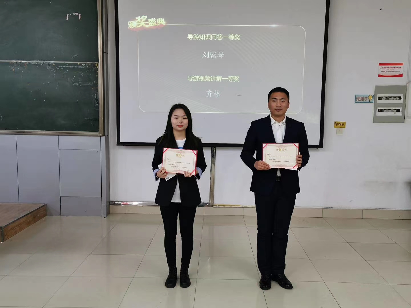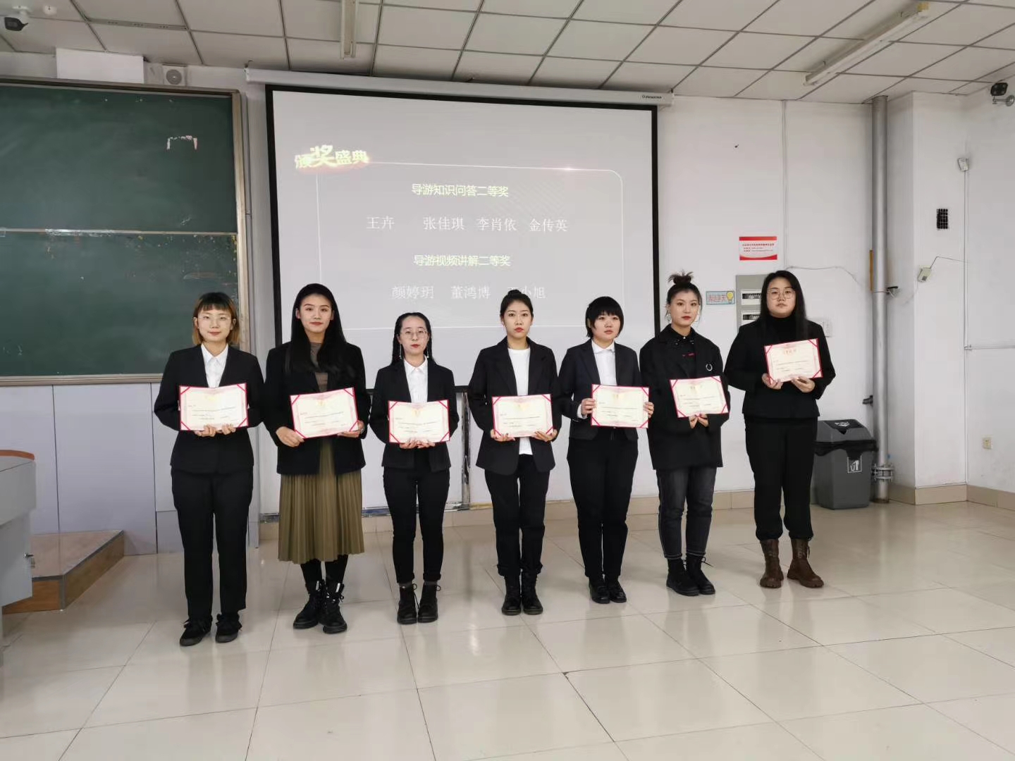 大赛共分为两个部分:一是导游视频讲解,每名学生自选景点,提交5分钟视频;一是导游知识问答,从1000道题中选择100题在学习通上进行考核。经过激烈比拼,最终决出导游视频讲解一等奖1名,二等奖3名,三等奖6名;导游知识问答一等奖1名,二等奖4名(有并列),三等奖6名。