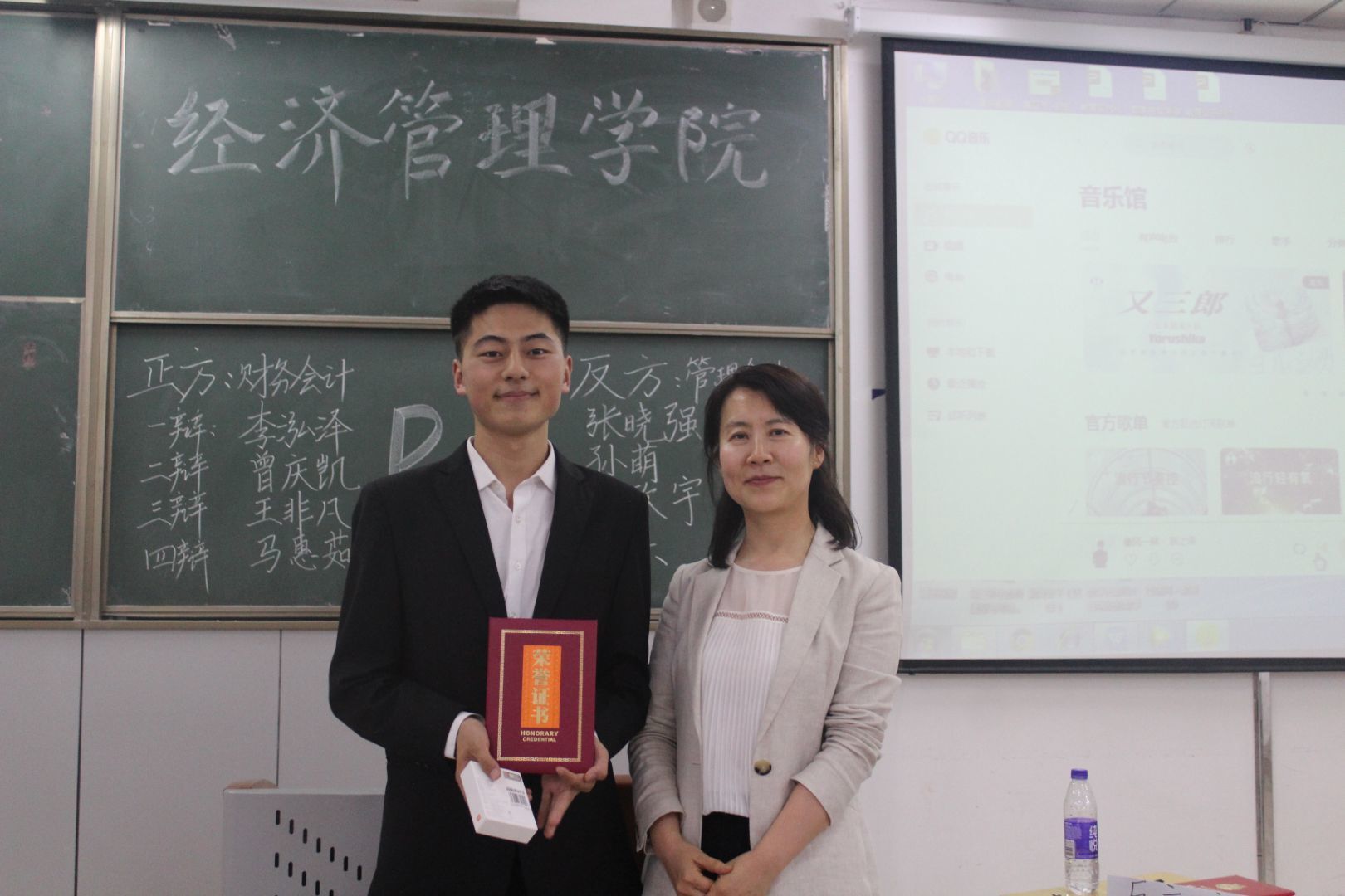 最后,在公布结果之前,由张晓强同学进行表演一首歌曲,大家被歌声吸引,欢颜笑语。短暂欢笑后进行令人激动的颁奖环节,由张晓强等四位同学组成的反方获胜,最佳辩手则是正方二辩曾庆凯。通过辩论赛活动,正反方成员之间积极合作,彼此交流各自的想法,锻炼了自己的思维及表达能力。本次辩论赛在大家的合影中落幕,本次辩论赛取得圆满成功。