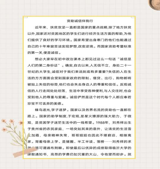 为落实立德树人根本任务,承扬中华民族重信守诺美德,进一步强化学生的诚信意识,培养学生的诚信品质,推动学生资助工作和思想政治教育工作持续健康发展,培养学生诚信品质,弘扬契约精神,增强资助育人成效,2022年5月3日-7日,jdb电子中国官方网站积极组织开展了资助诚信教育主题征文比赛活动,号召同学们以诚信为做人的原则,做一个诚实守信的人。