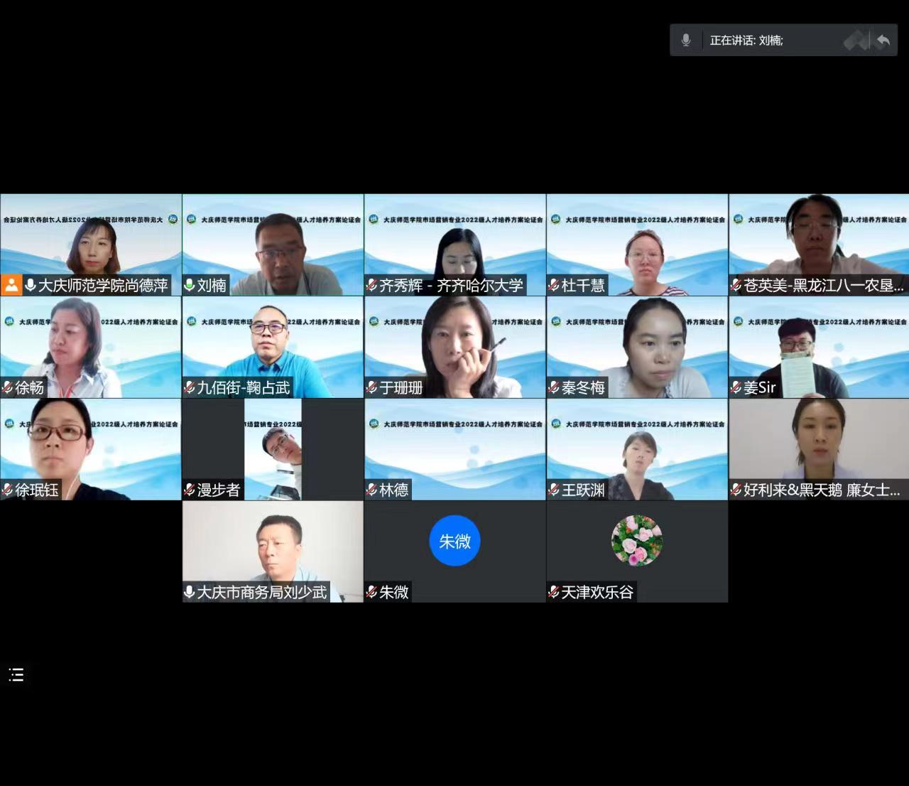 2022年7月15日13:30-15:30,市场营销系召开了2022级人才培养方案论证会,会议采用腾讯会议的方式,邀请了政府、合作企业和高校的专家10位,大庆市商务局电子商务科科长刘少武、齐齐哈尔大学市场营销系主任齐秀辉、东北石油大学营销与旅游系主任徐畅、黑龙江八一农垦大学市场营销系主任苍英美、北京巨量引擎网络技术有限公司巨量部于珊珊、北京市好利来&黑天鹅餐饮管理有限公司招聘部负责人廉美琦、天津欢乐谷人事部经理刘喆、哈尔滨润牛商业有限公司人力资源部主任王雪、大庆九佰街网络科技有限公司董事长鞠占武10专家和jdb电子中国官方网站行政负责人刘楠、教学负责人李媛媛、科研负责人孙伟仁以及市场营销系全体教师参加了论证会,会议由市场营销系主任尚德萍主持。