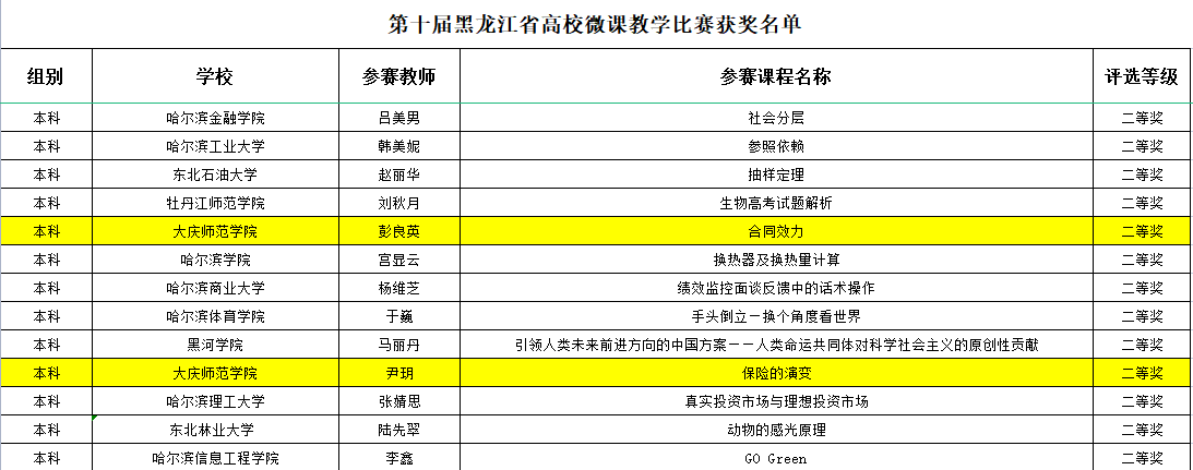 在2023年第十届黑龙江省高校微课教学比赛活动中,jdb电子中国官方网站彭良英、尹玥两位老师双双获本科组二等奖,我院教师连续三年在黑龙江省高校微课教学比赛中有所收获,并将以本次获奖为契机,不断促进信息技术与学科教学融合,充分发挥信息技术对高等教育发展的引领作用,推动我院教师专业发展和教学能力提升,号召全体青年教师不断更新教育观念,不断加强教学内容与教学方法的改革研究,促进我院教学质量的不断提高