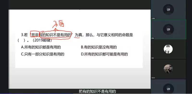 黄佳老师为同学们简要介绍了银行招聘笔试的考试题型与考情分析,随后重点讲解了命题推理题型的主要特征与解题技巧。在授课过程中,黄佳老师为同学们阐释了“命题”的概念,提醒大家在面对命题推理类问题时要重视命题的客观性,切勿过度推理。此后,黄佳老师针对每种命题选择了部分银行笔试招考逻辑思维训练真题为同学一一讲解。