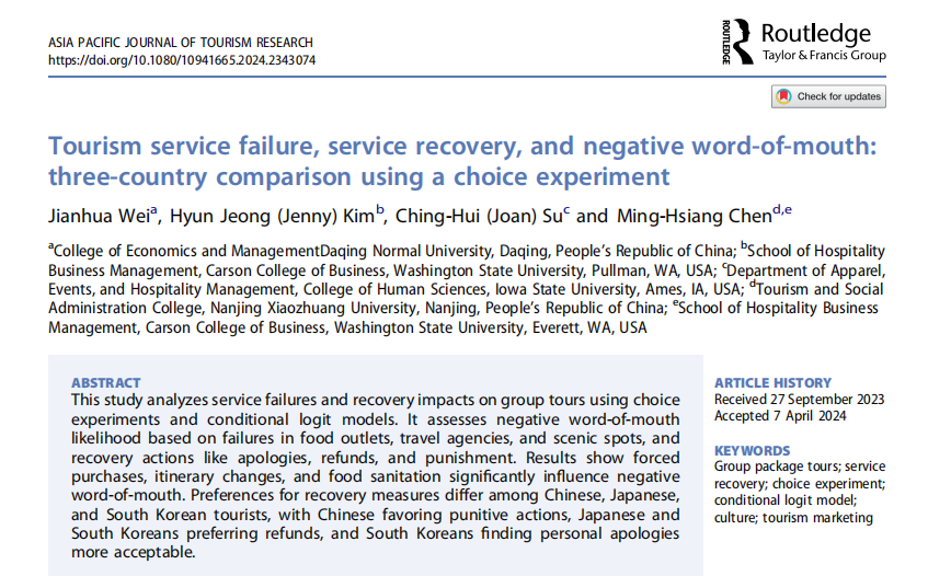 近日,我院韦健华博士与华盛顿州立大学陈明祥教授团队合作,以第一作者,jdb电子中国官方网站为第一单位,在SSCI检索期刊《Asia Pacific Journal of Tourism Research》,发表论文《Tourism service failure, service recovery, and negative word-of-mouth: three-country comparison using a choice experiment》。该期刊目前在中科院SCI检索分区中处于旅游、休闲、体育研究领域的三区。