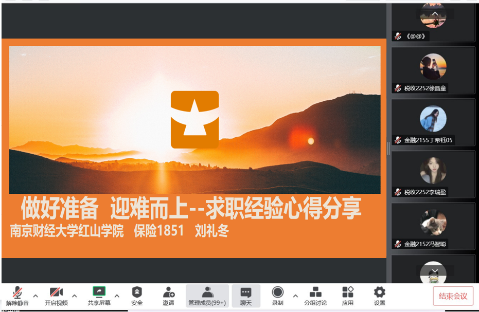 11月20日下午,我系邀请资助中心主管刘馈馈老师,开展题为“更新就业观念,做自律职业人”讲座,为我系学生做就业指导。本次讲座由我系学工秘书胡婉君老师组织并主持,我系学生积极参加线上会议。